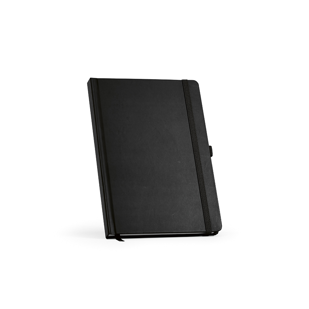 Marquez A5 Notizbuch mit Festeinband, gefertigt aus recyceltem Papier. Es enthält 196 linierte Seiten aus recyceltem, elfenbeinfarbenem 70gsm Papier, jede mit einem vorgesehenen Feld für Datum und Seitenzahl sowie einem Lesezeichenband. Das elastische Verschlussband und die erweiterbare Innentasche sorgen für zusätzlichen Komfort.