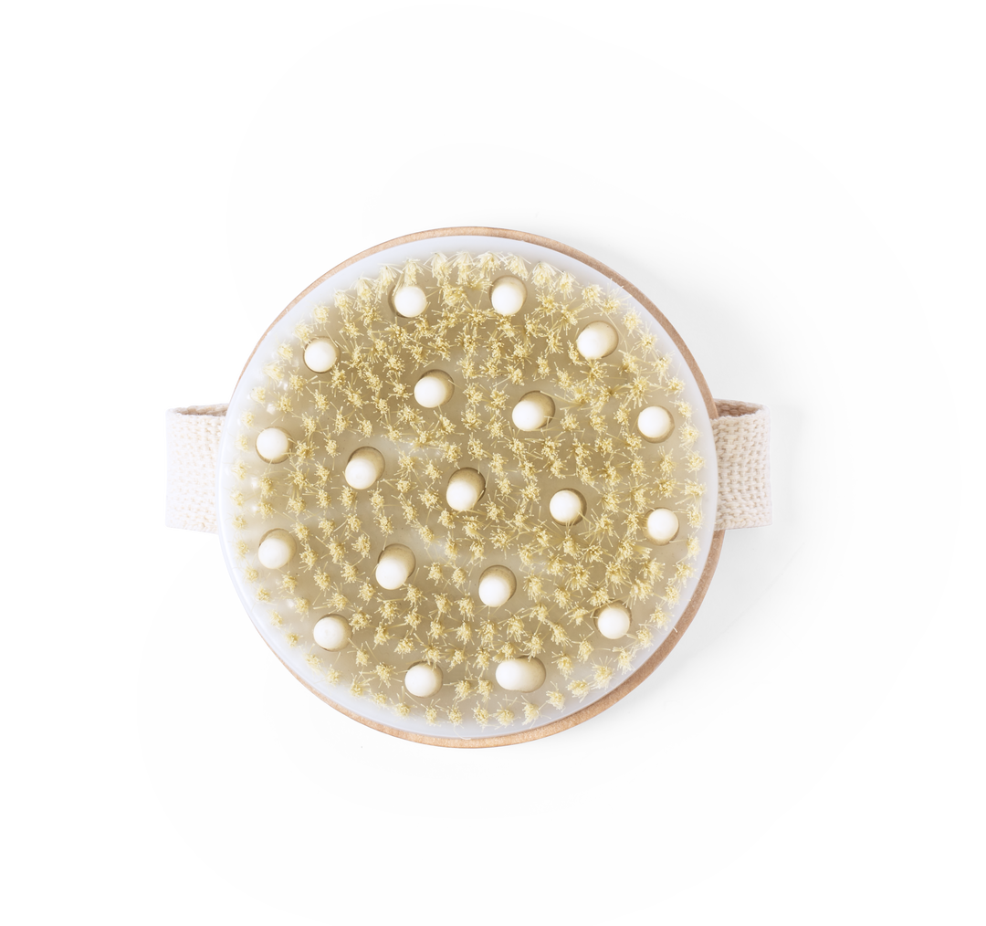 Peeling-Massagebürste aus Naturholz, mit passendem Befestigungsband. Präsentiert in einem Beutel aus natürlicher Baumwolle mit Kordelzugverschluss.