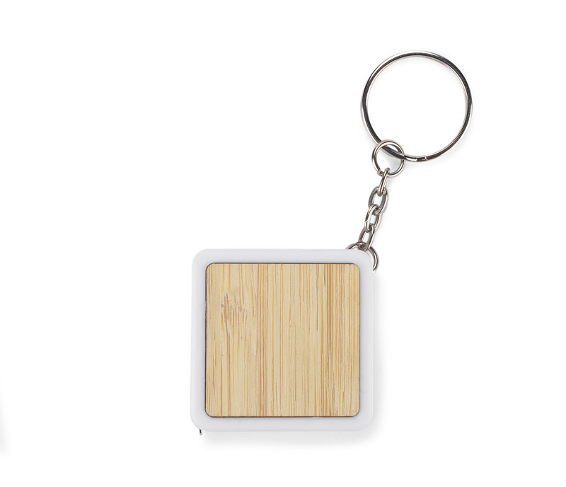 DULO Maßband, 1 m lang, mit Schlüsselanhängerfunktion. Hergestellt aus Kunststoff kombiniert mit einer Bambusoberfläche.