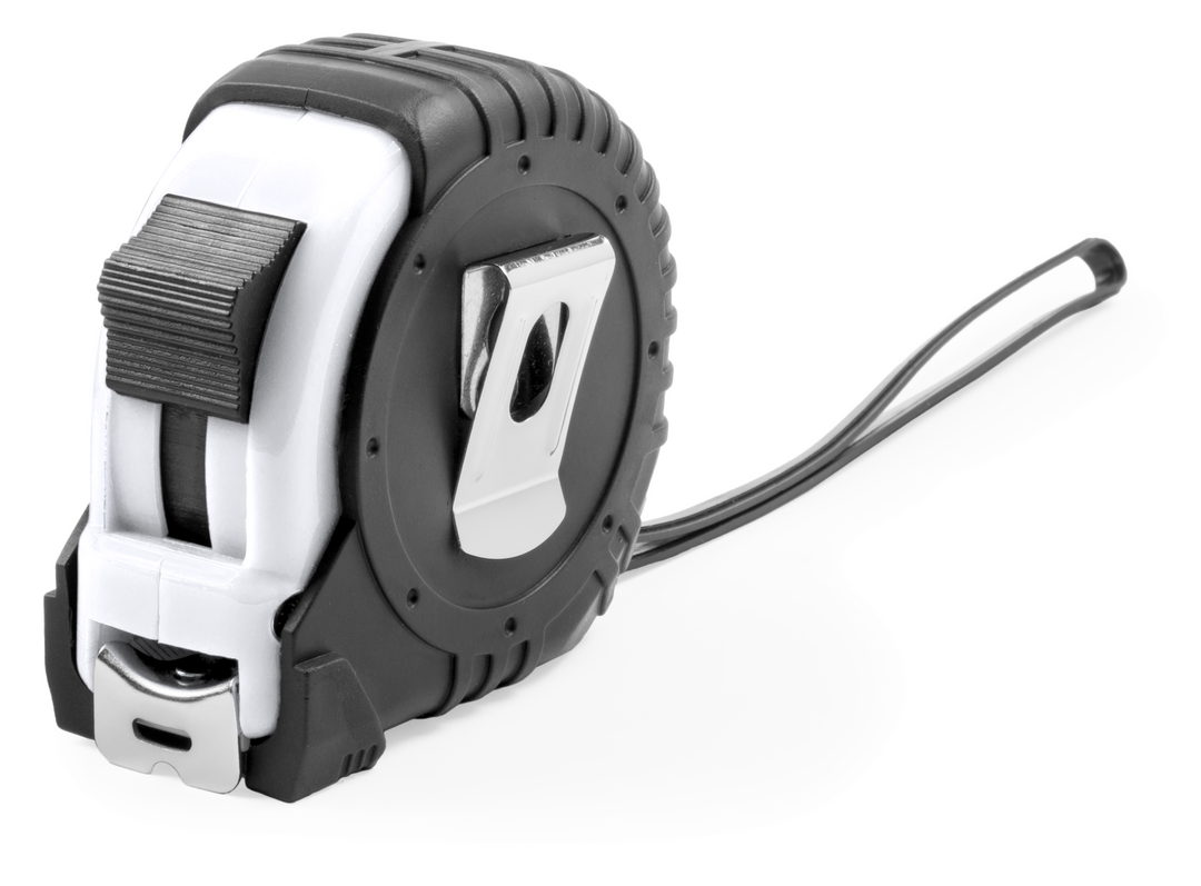 7,5-Meter-Flexometer mit Metallklinge und Verriegelungsmechanismus. Mit weichem Körper in verschiedenen Farben, beschichtet mit einer Schutzhülle aus widerstandsfähigem Gummi, Metallclip für Gürtel und Tragegurt. Präsentiertn in einer individuellen Schachtel.