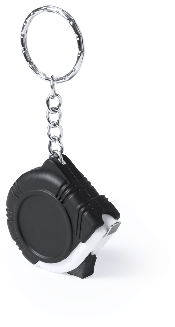 Schlüsselanhänger mit 1 m langem Metallmaßband mit Verriegelungsmechanismus. Maßangabe in Zentimeter, Zoll und Fuß. Mit spezieller Stanzung zum Bedrucken.