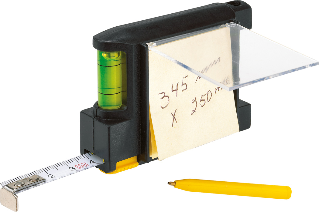 Maßband NOTY: mit Einrollfunktion, Wasserwaage, Notizblock und Stift, praktischer Befestigungsclip auf der Rückseite, 2 m