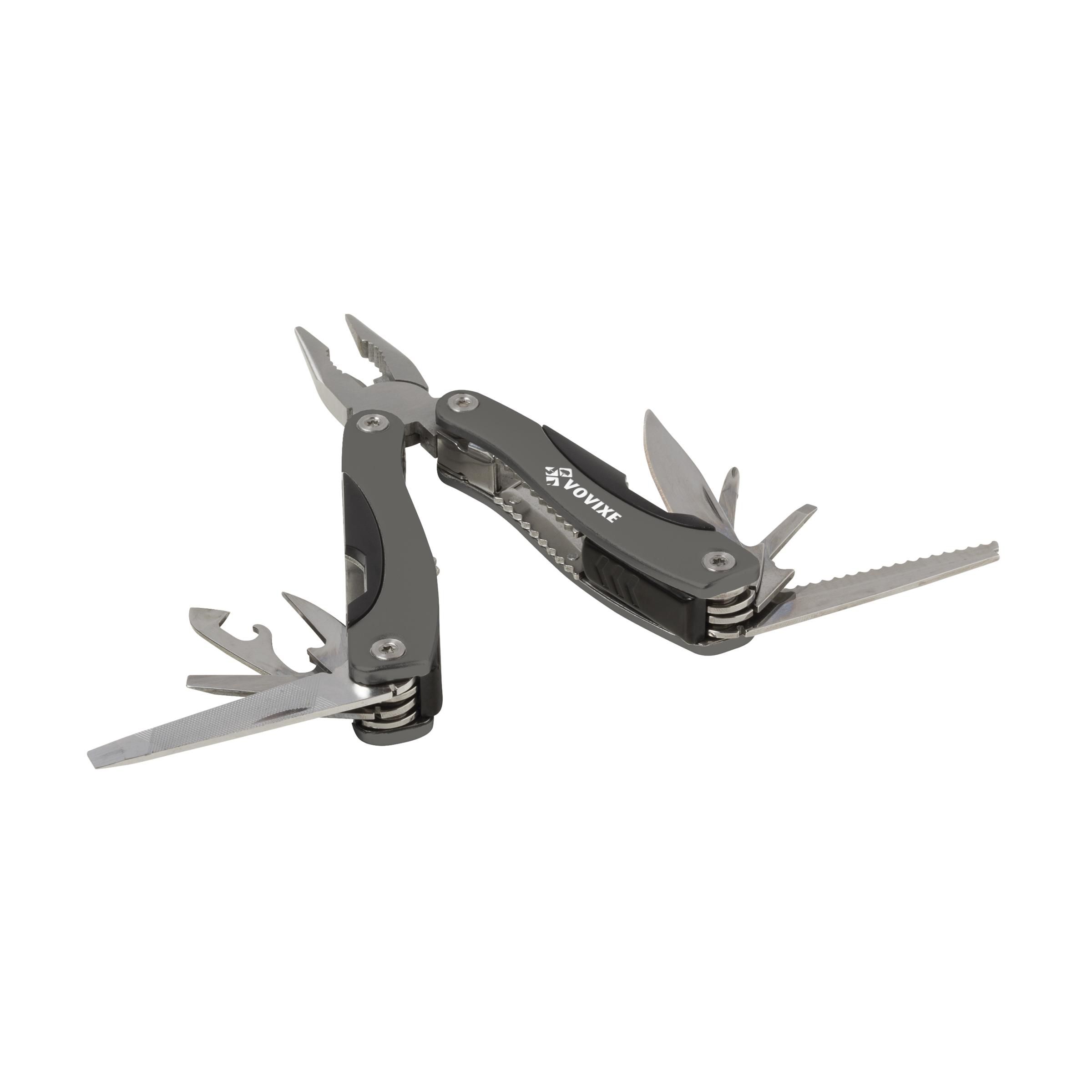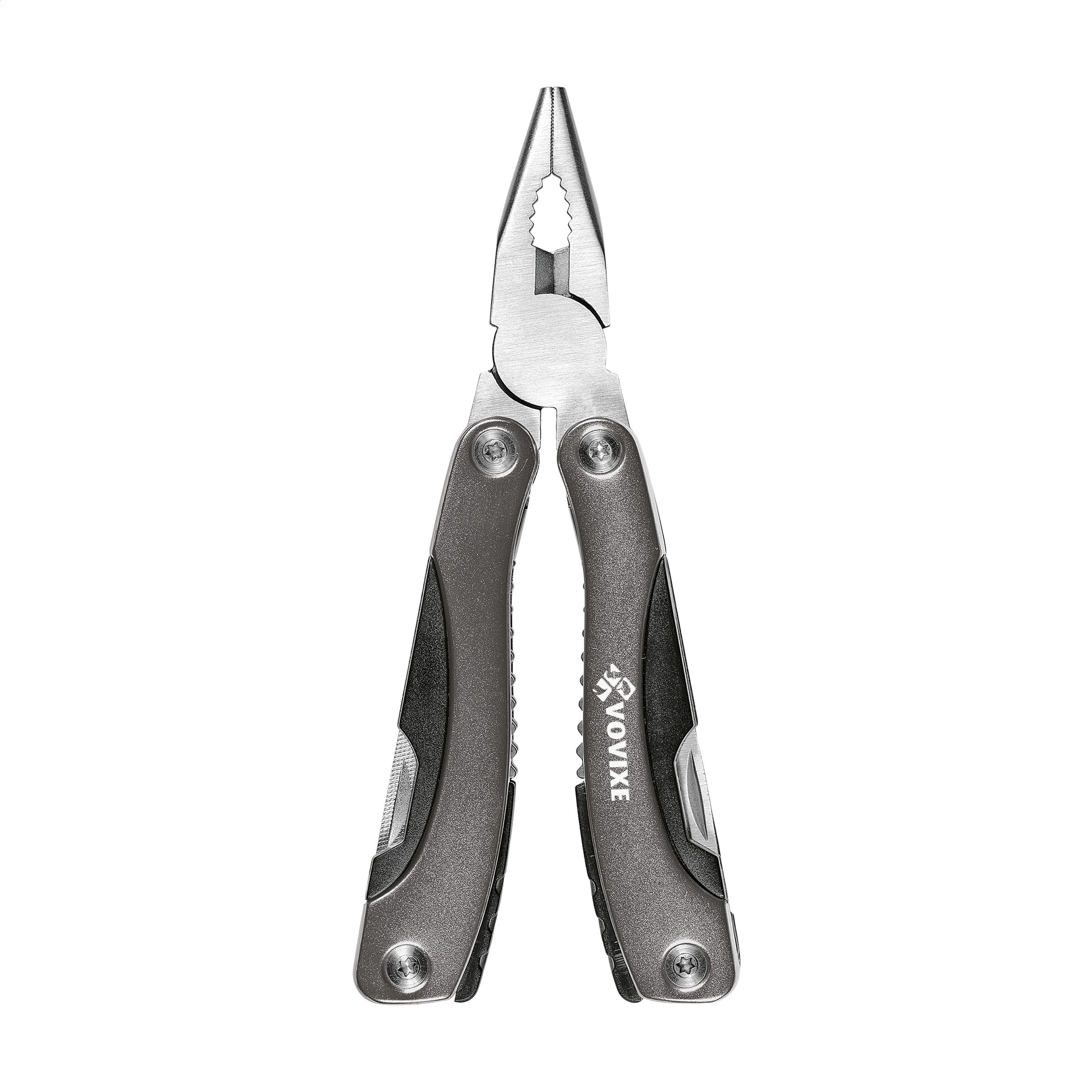 Kompakte Multizange aus Edelstahl mit Handgriff aus Aluminium im Metalliclook. 9-teilig mit 13 Funktionen: Zange, Isolierzange, 3 Schraubenzieher, Reibahle, Feile, Dosenöffner, Kapselheber, Fischentschupper, Haken-Entferner, Messer, Kreuzschraubenzieher. Mit Schloss. In einem Nylonetui. Beachten Sie, dass möglicherweise lokale Vorschriften für den Besitz und / oder das Tragen von Messern oder Multitools in der Öffentlichkeit gelten. Wird einzeln in einem Kraftkarton geliefert.