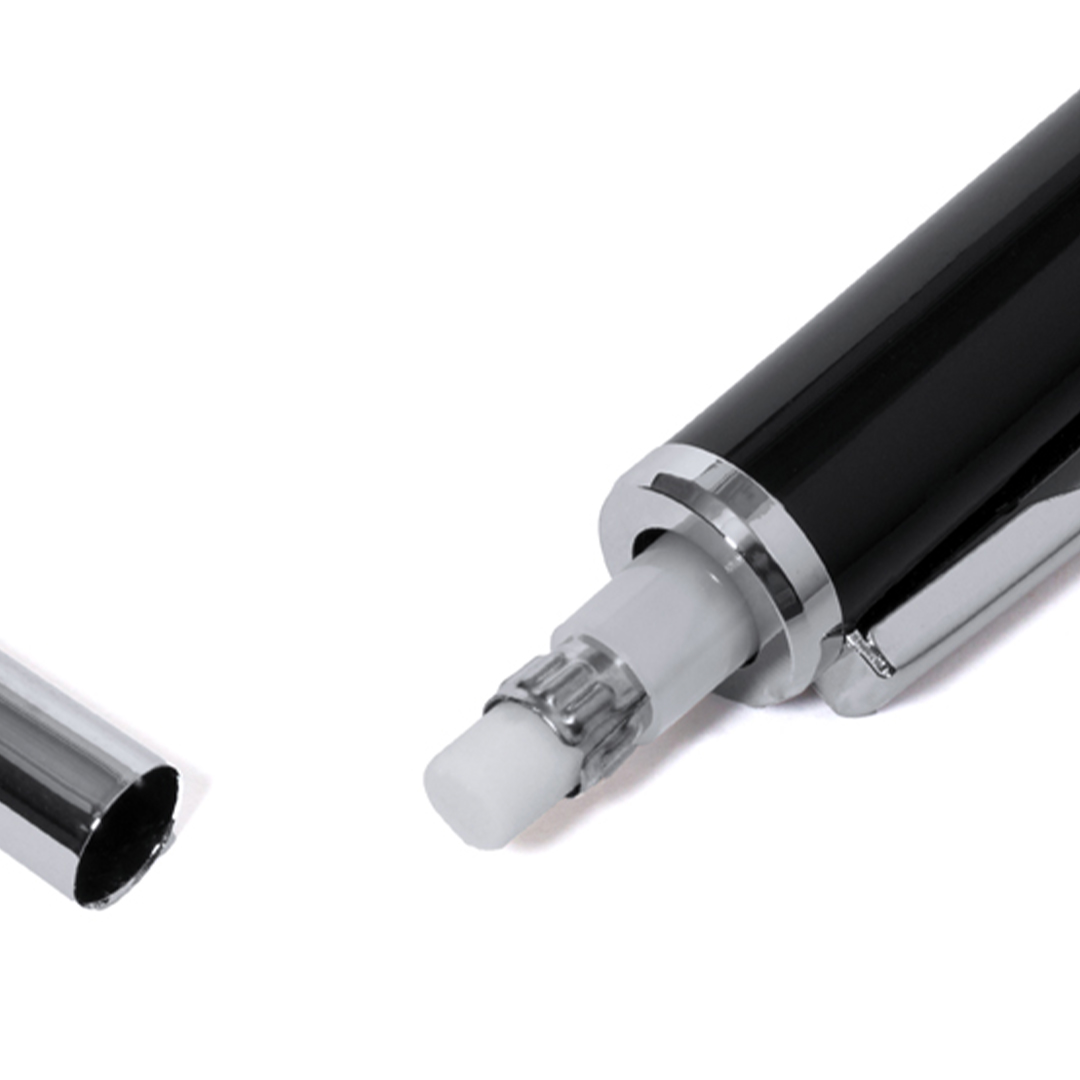 Stilvoller Druckbleistift aus robustem ABS. Schwarzer Schaft und passender glatter Griff, mit verchromtem Druckknopf, Clip, Spitze und Mittelring. Inklusive Radiergummi und 0,7 mm Minen.