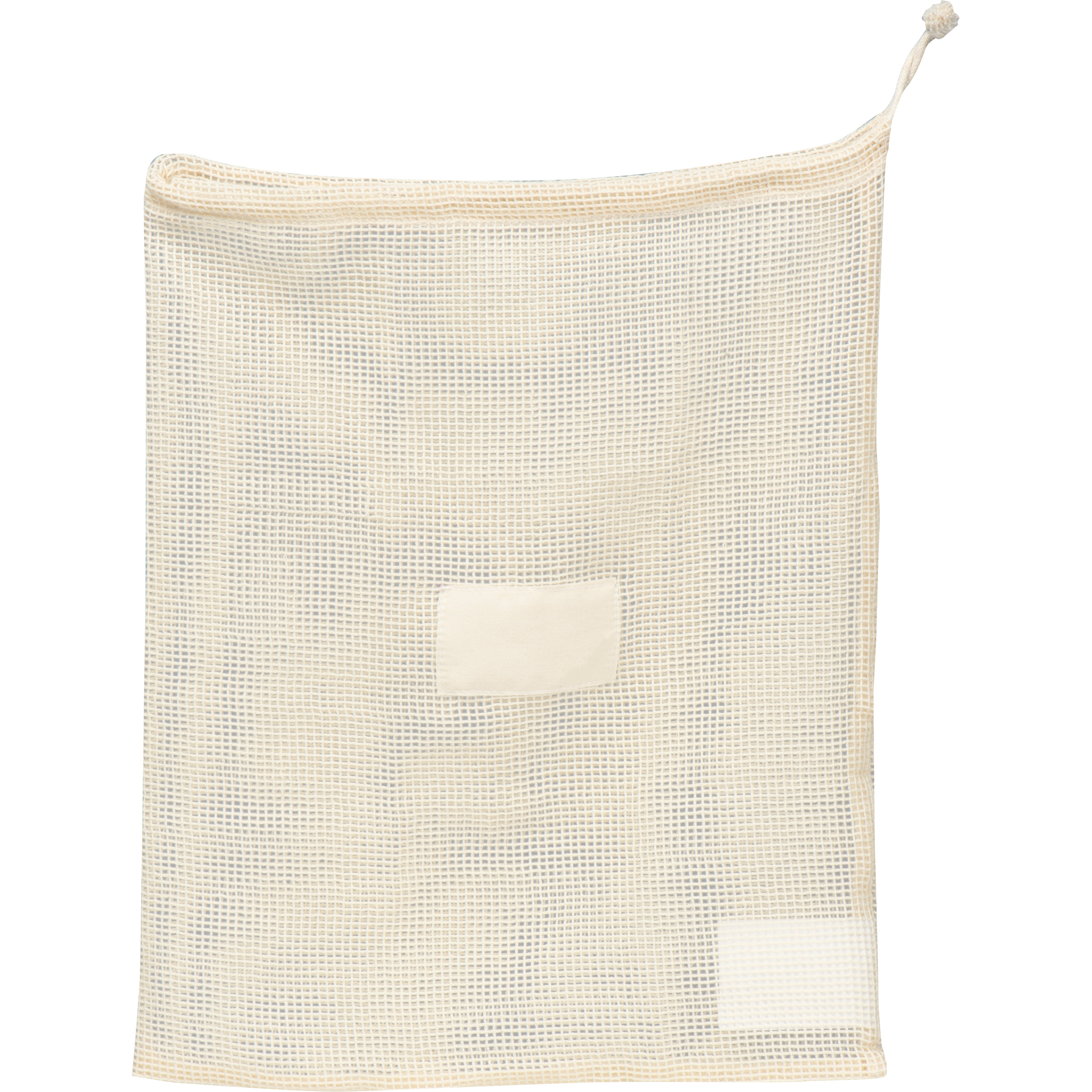 Waschbares Mehrwegnetz aus Baumwolle für Obst, Gemüse und mehr. Mit Kordel zum Verschließen und kleinem Feld aus Baumwolle auf der Vorderseite für Ihren Werbeaufdruck.