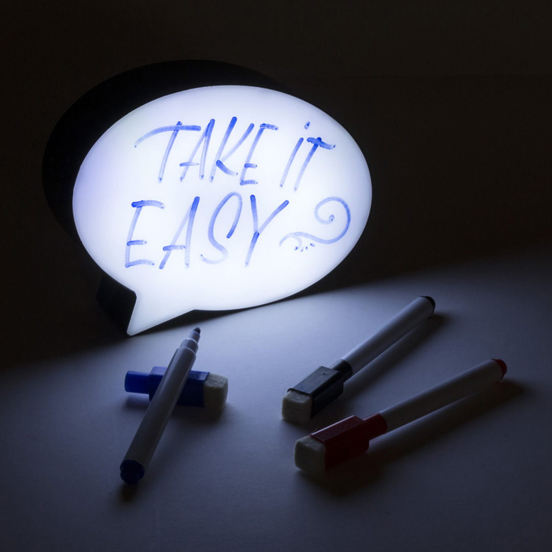 Lustige Dekolampe in Form einer Sprechblase. Mit 8 LEDs, ON / OFF-Taste und drei Markern in den Farben Blau, Schwarz und Rot - mit integriertem Radierer im Deckel. Batteriebetrieben - 3 x AAA nicht inklusive. Präsentiert in einer attraktiven Designbox.