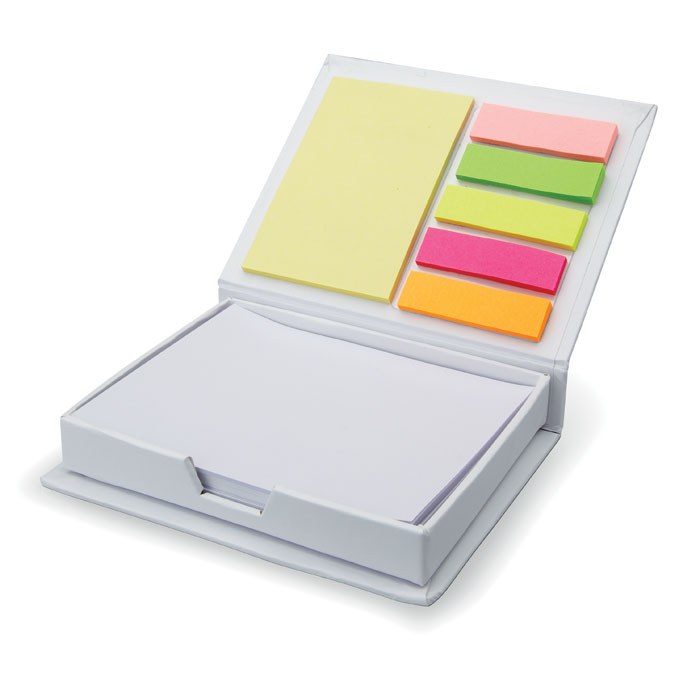 Zettelbox aus Karton mit 100 Blatt weißen Notizzetteln, gelben Haftnotizen und 5 farbigen Markerblöcken. FSC®-certified | FSC 100%, P5.1, FSC-C213206