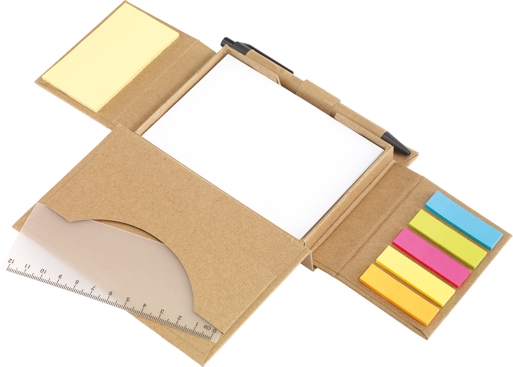 Memobox POP UP: zum Aufklappen, inklusive Kugelschreiber aus Pappe (schwarzschreibend), Lineal (12 cm), 100 weiße Notizzettel, verschiedenfarbige Klebezettelblöcke – aus recycelbaren Materialien
