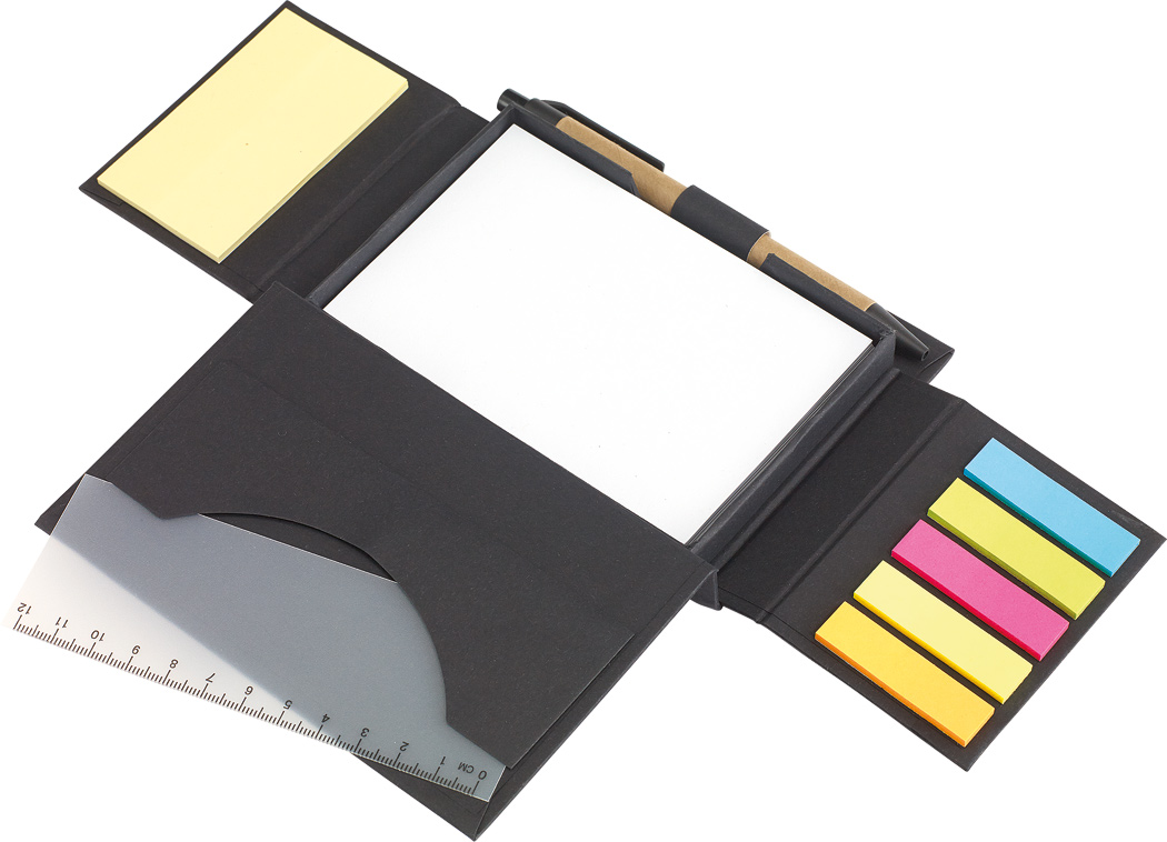 Memobox POP UP: zum Aufklappen, inklusive Kugelschreiber aus Pappe (schwarzschreibend), Lineal (12 cm), 100 weiße Notizzettel, verschiedenfarbige Klebezettelblöcke – aus recycelbaren Materialien