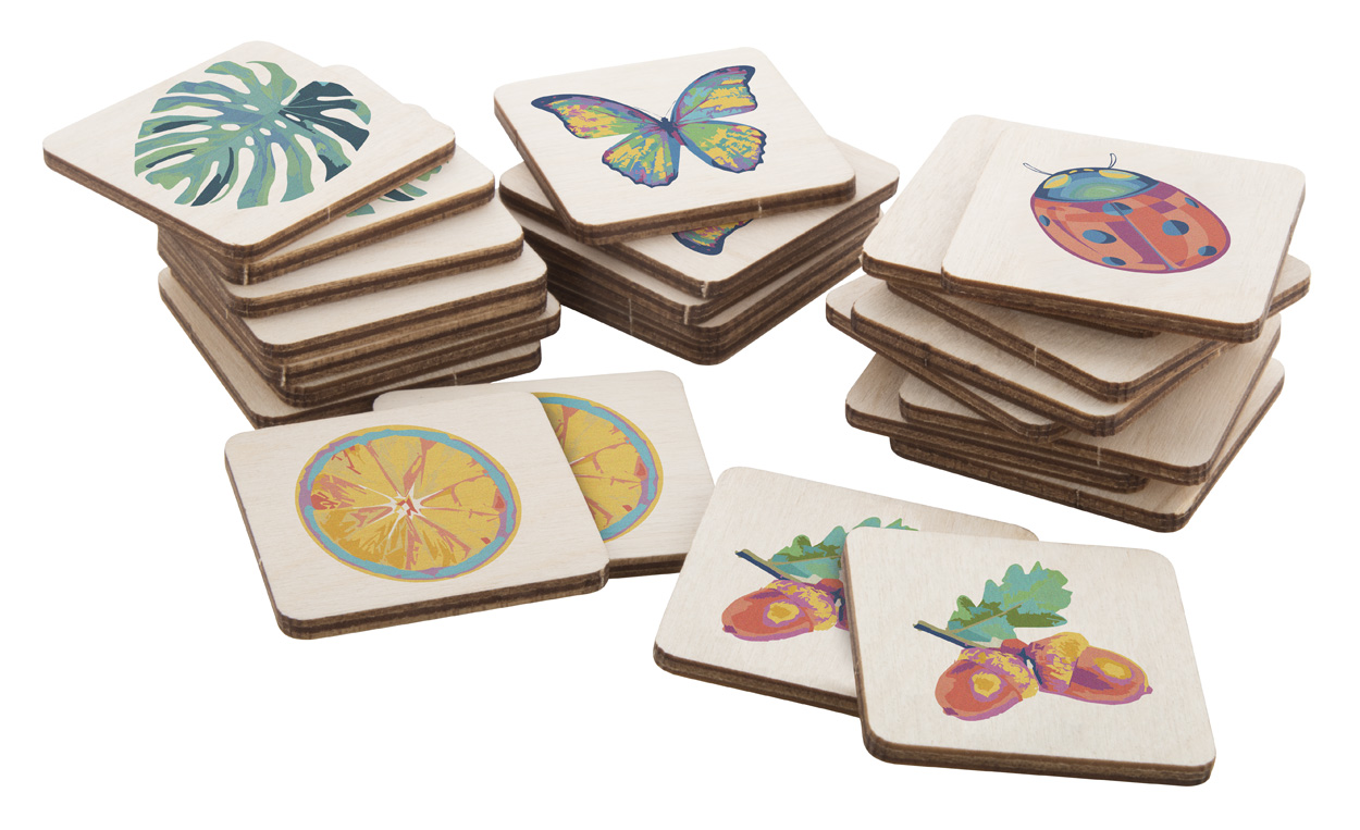 Memory-Spiel aus laminiertem Birkensperrholz mit individuellen Motiven. Das Spiel besteht aus 24 Teilen (40 x 40 mm). Der Preis ist inklusive 12 unterschiedlichen Motiven (CMYK) auf der Vorderseite (je zwei Spielsteine) und einem identischen vollfarbigen Logodruck auf der Rückseite aller Spielsteinen. Mindestmenge: 250 Stk.