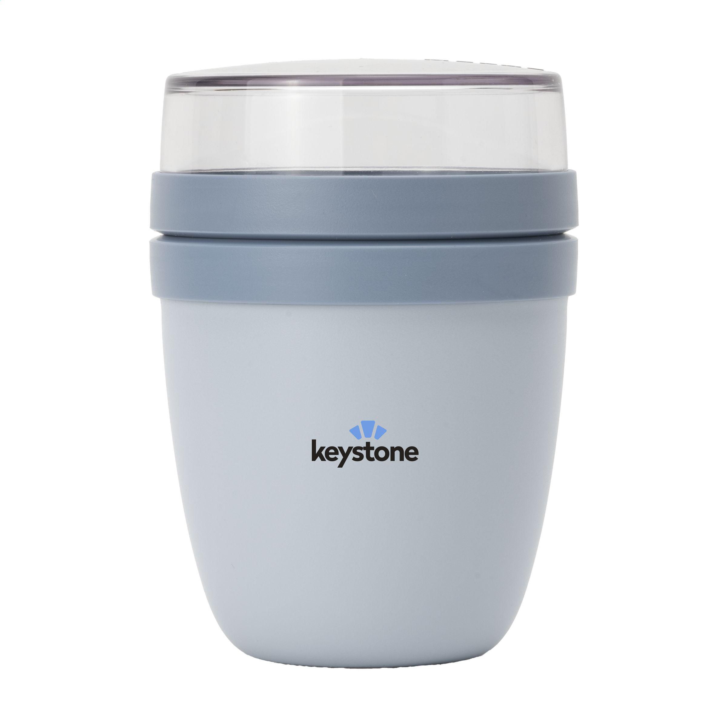 Dieser Plastikbehälter der Marke Mepal ist ein praktisches Produkt zum Mitführen von Lebensmitteln. Der Behälter hat zwei Teile. Durch eine Drehbewegung lassen sich die beiden Teile voneinander trennen. Beide Teile haben einen separaten Deckel. Die ideale Lösung, um Geschmiere beim Mischen zu vermeiden. Der Inhalt des oberen, transparenten Behälters beträgt 120 ml, d. h. dort ist Platz für ca. 50 g Müsli oder Obst. Der Inhalt des unteren Behälters bietet mit 300 ml genug Platz für eine Portion Suppe, Nudeln oder Joghurt. Ein qualitativ hochwertiges Produkt. BPA-frei, lebensmittelgeprüft und auslaufsicher. Geeignet für Mikrowelle (außer Deckel) und Gefriertruhe. 2 Jahre Mepal Herstellergarantie. Hergestellt in den Niederlanden. LAGERBESTANDSINFORMATION: Bis zu 1.000 Stück innerhalb von 10 Arbeitstagen verfügbar. Ausnahmen vorbehalten. Mepal ist B-Corp-zertifiziert; die Kollektion wird nach den höchstmöglichen ökologischen und sozialen B-Corp-Standards hergestellt.