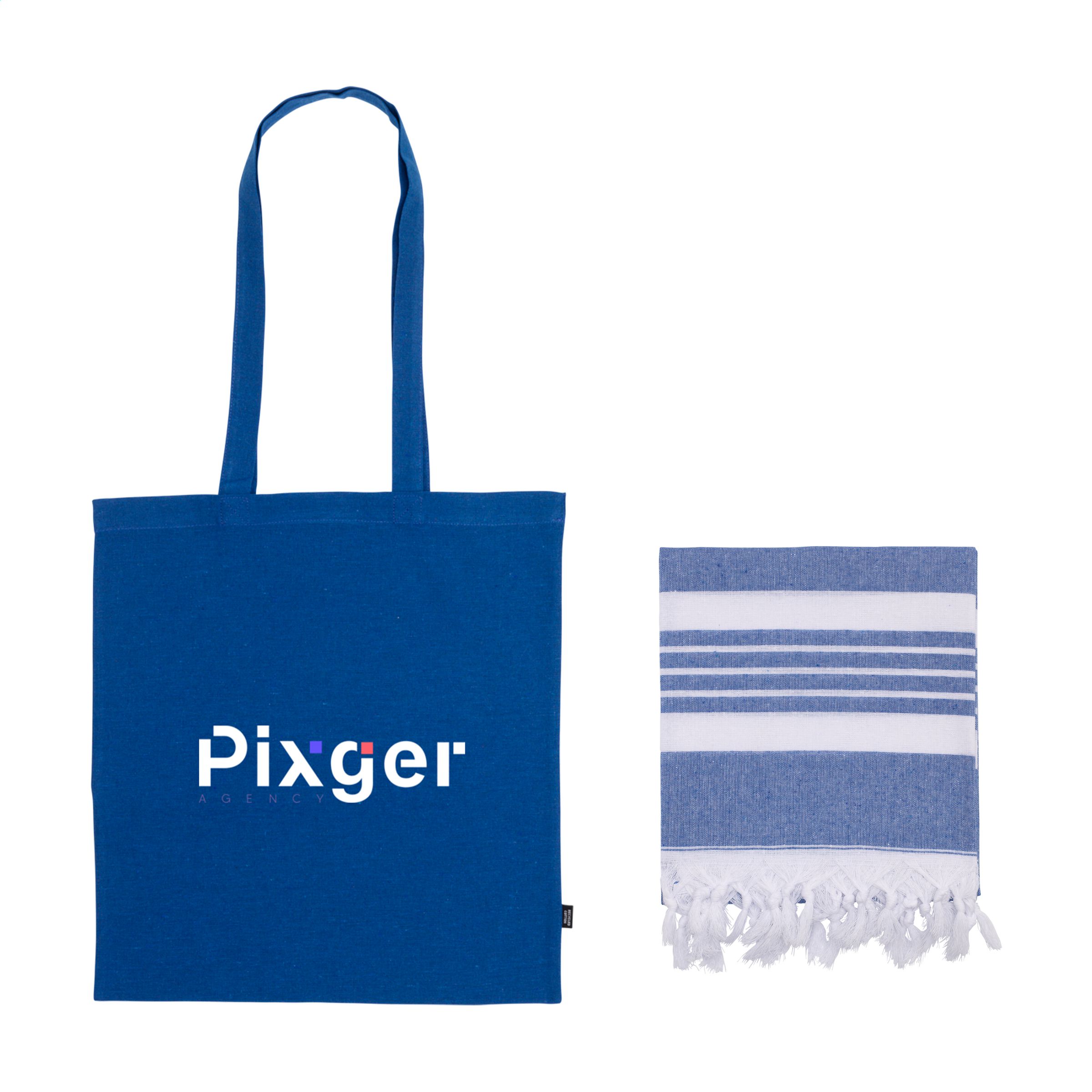 Feiern Sie den Sommer mit diesem auffallend schönen Set: • weiches Oxious Hamam Promo-Handtuch, Maße 170 x 100 cm • praktische Tasche aus GRS-zertifizierter, recycelter Baumwolle. Ein wunderschönes Werbegeschenk für Kunden, Besucher und Mitarbeiter. Gestalten Sie dieses Set noch persönlicher: Lassen Sie einen Namen, ein Zitat oder ein Logo auf die einzelnen Produkte drucken. Das Handtuch kommt in der Tasche.