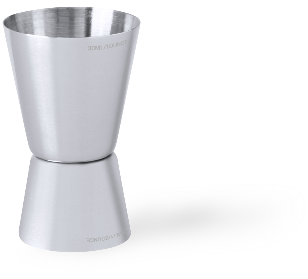 Doppelmessbecher aus Edelstahl mit mattem Finish. Speziell für den Laserdruck entwickelt. Präsentiert in einer PVC-Schachtel.