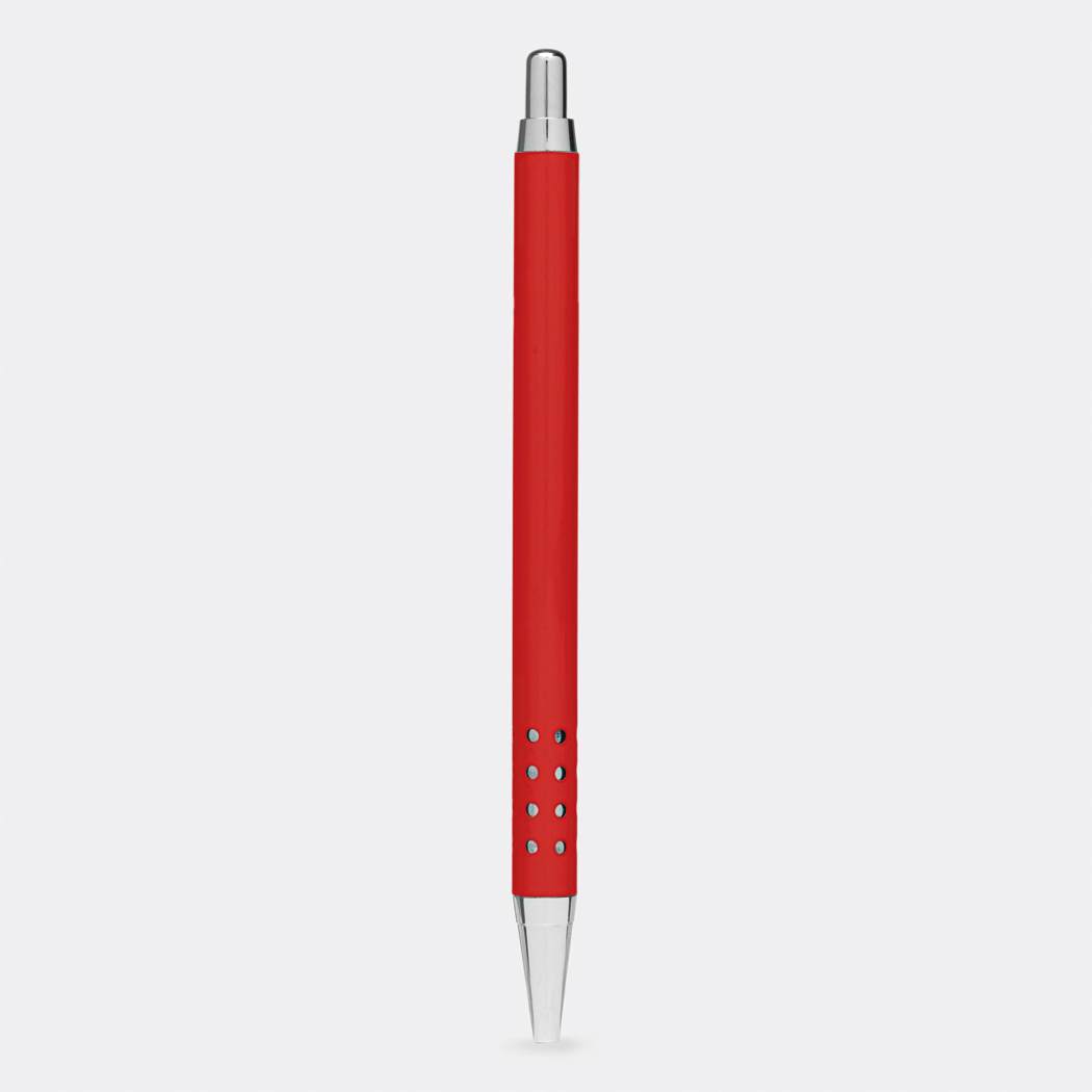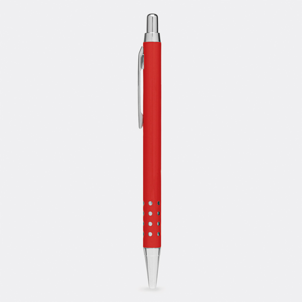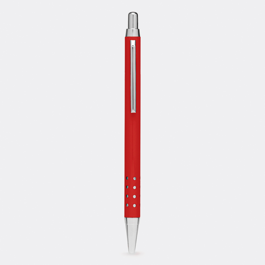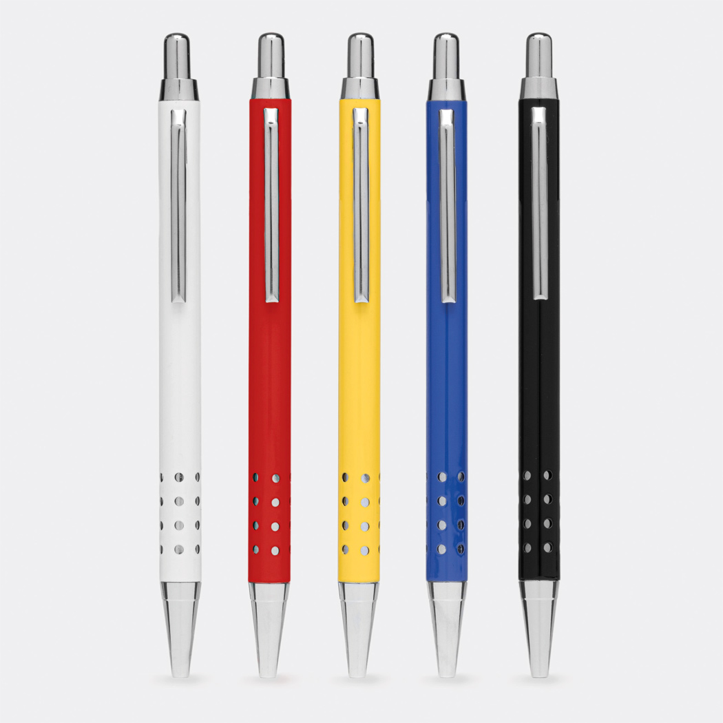 Messing-Kugelschreiber BUDAPEST: Schaft mit Loch-Design, Druckmechanismus, Großraummine, blauschreibend