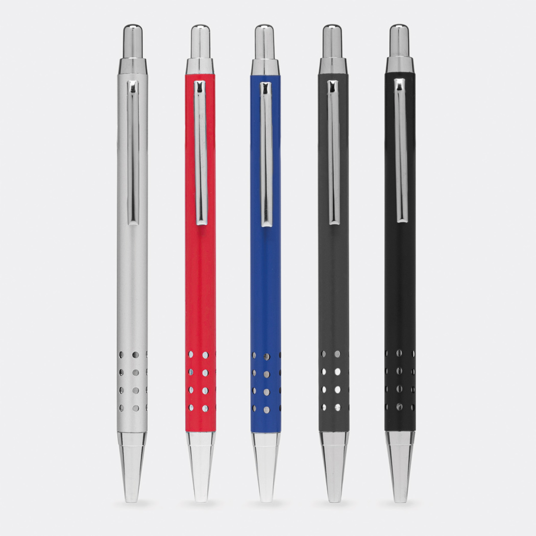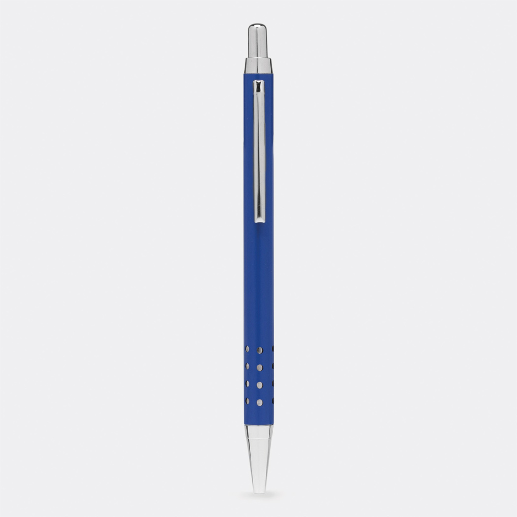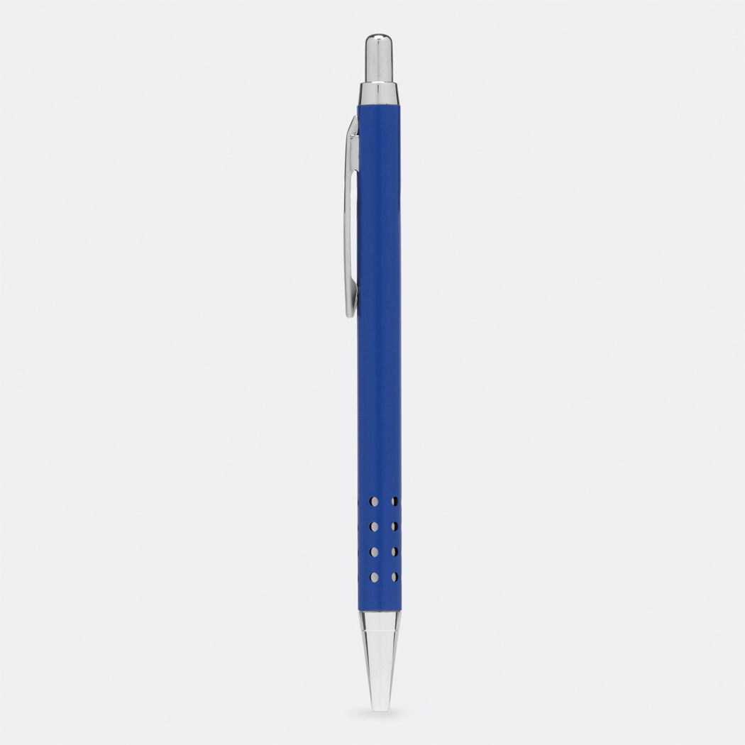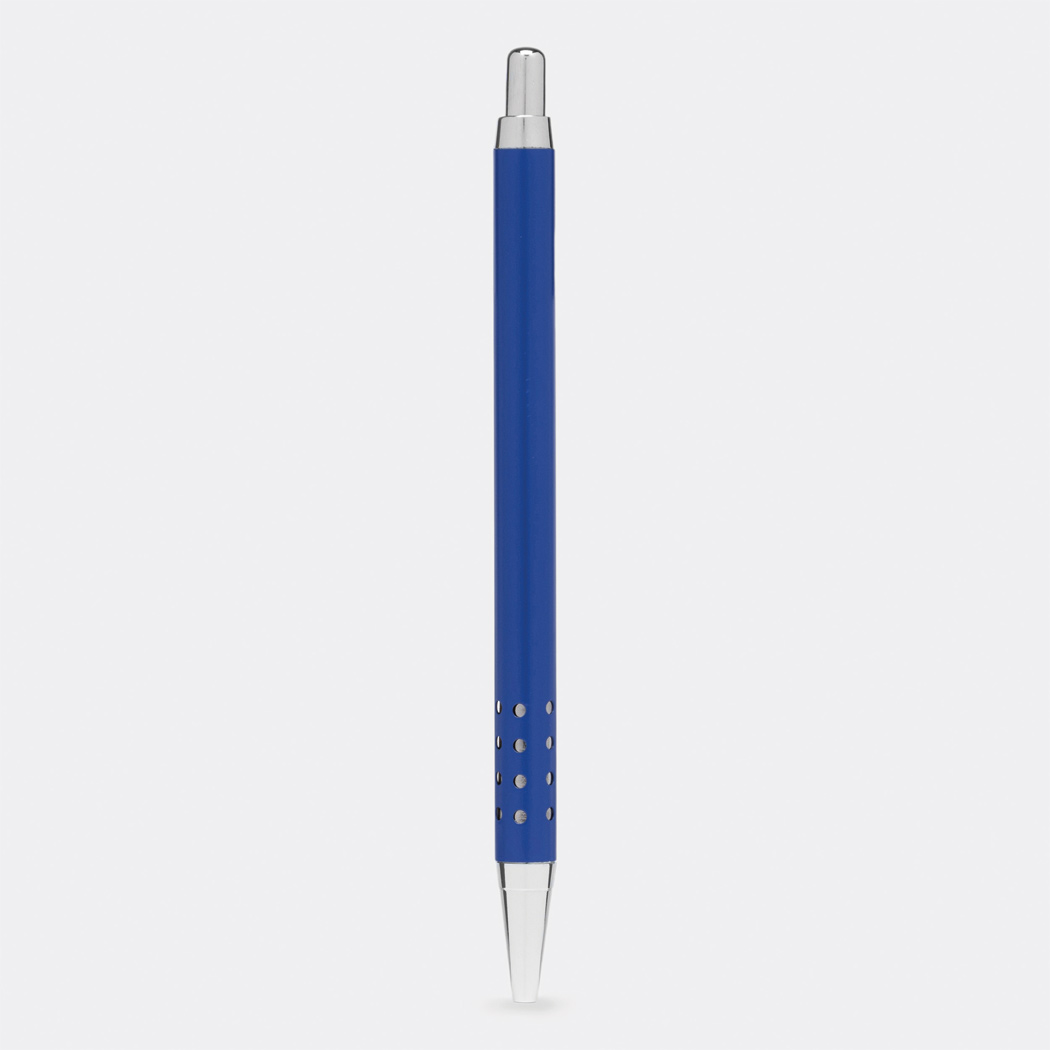 Messing-Kugelschreiber BUDAPEST: Schaft mit Loch-Design, Druckmechanismus, Großraummine, blauschreibend