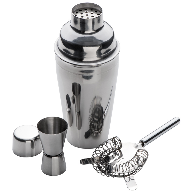 Hochwertiges, verchromtes Cocktailset bestehend aus einem Shaker, einem Messbecher und einem Bar-Sieb mit zwei Stützen. Rostfreier Edelstahl macht das Set unverwüstlich. Ihre Werbung wird mittels Lasergravur auf dem Shaker angebracht.