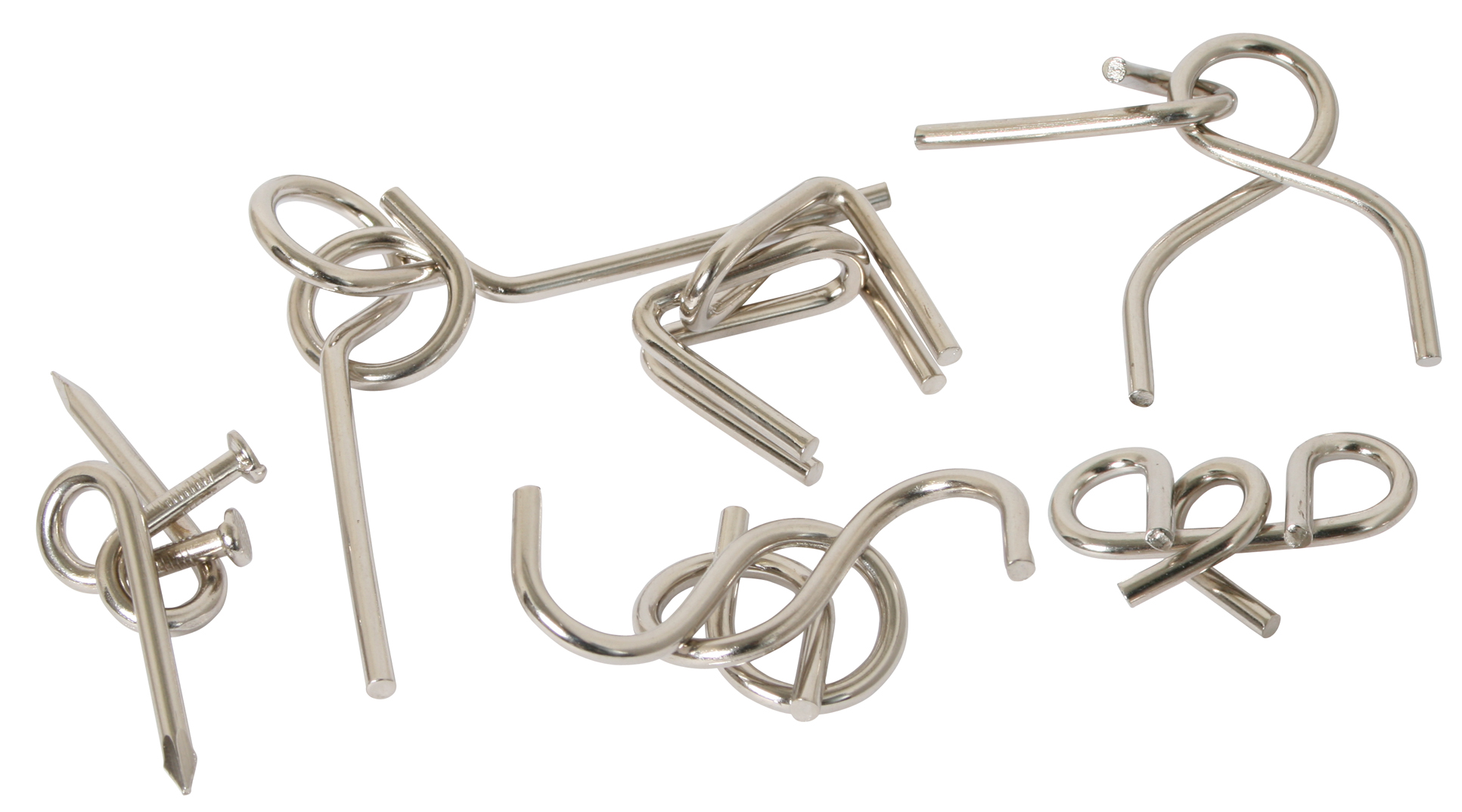 Sechs knifflige Puzzles im Set. Da hat einer Nägel und Drähte verbogen. Und Sie müssen die nun wieder auseinander puzzeln. Das ist ungerecht. Aber so ist das Leben ...