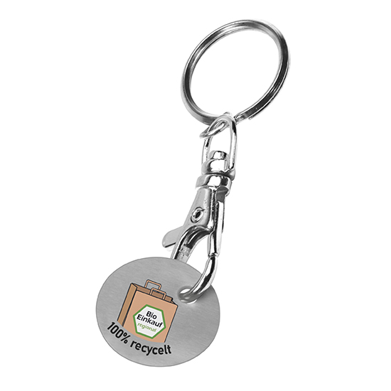 Metall-Karabinerhaken Recycling "Omega" mit Kunststoff-1€-Chip, aus ca. 100 % recyceltem Kunststoff