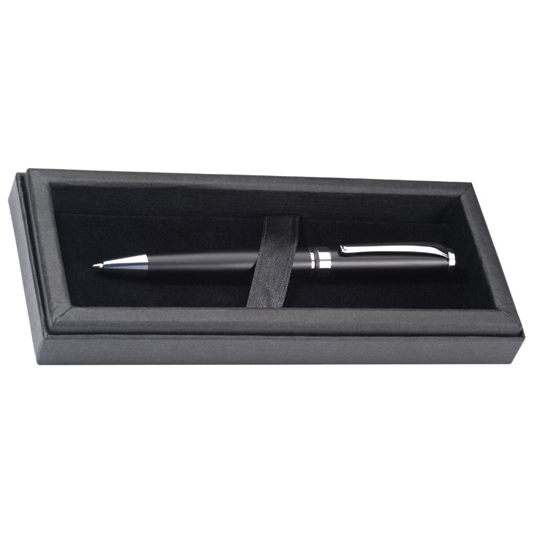 Metall Kugelschreiber in mattschwarz mit verchromten Applikationen, inkl. blauschreibender Metall Großraummine und elegantem Etui. Ihre Werbung bringen wir mittels Lasergravur auf der Kappe rechts vom Clip an.