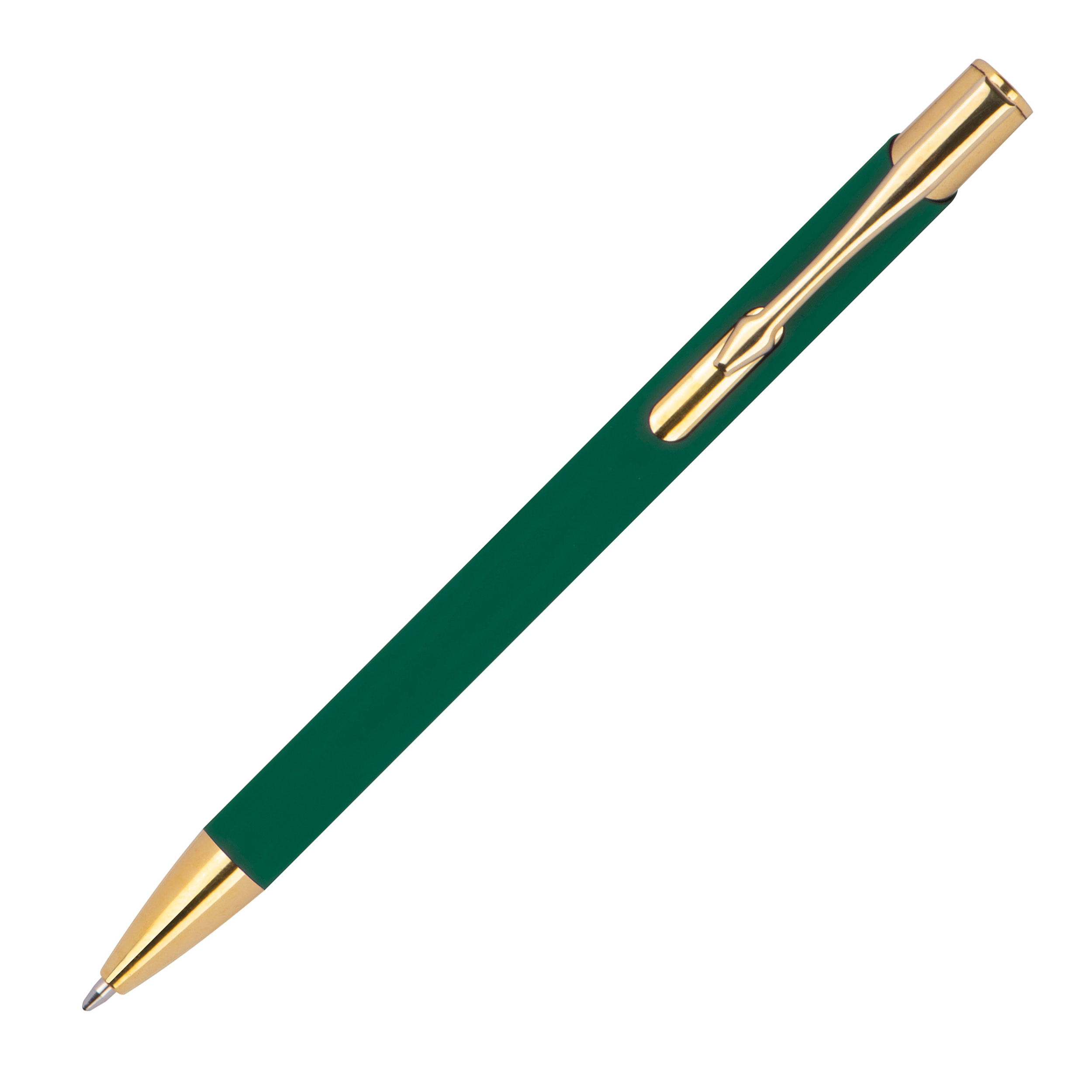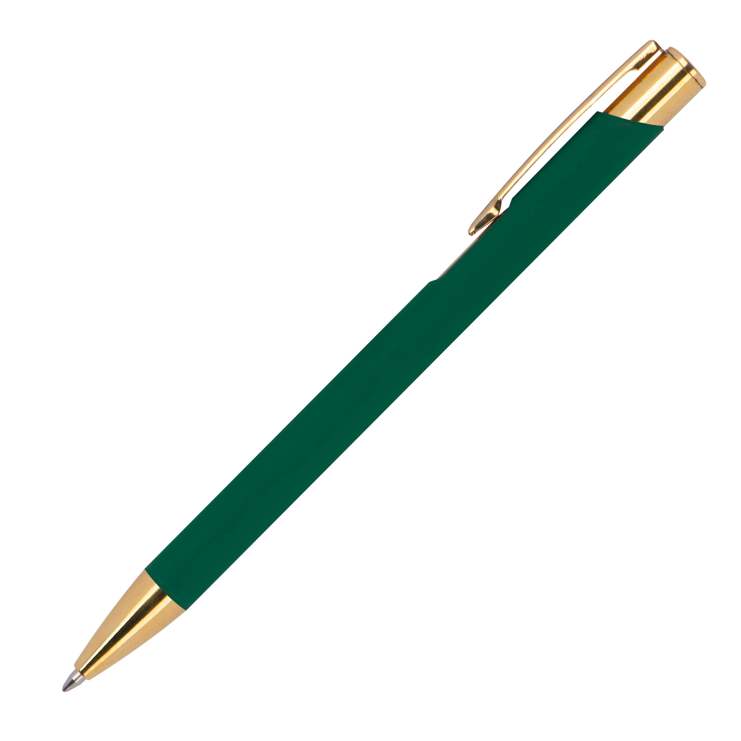 TOP PRICE! Kugelschreiber aus Aluminium mit goldenen Applikationen, rubber finish und blauschreibender Großraummine. Ihre Werbung lasern wird rechts vom Clip, diese erscheint goldfarben.
