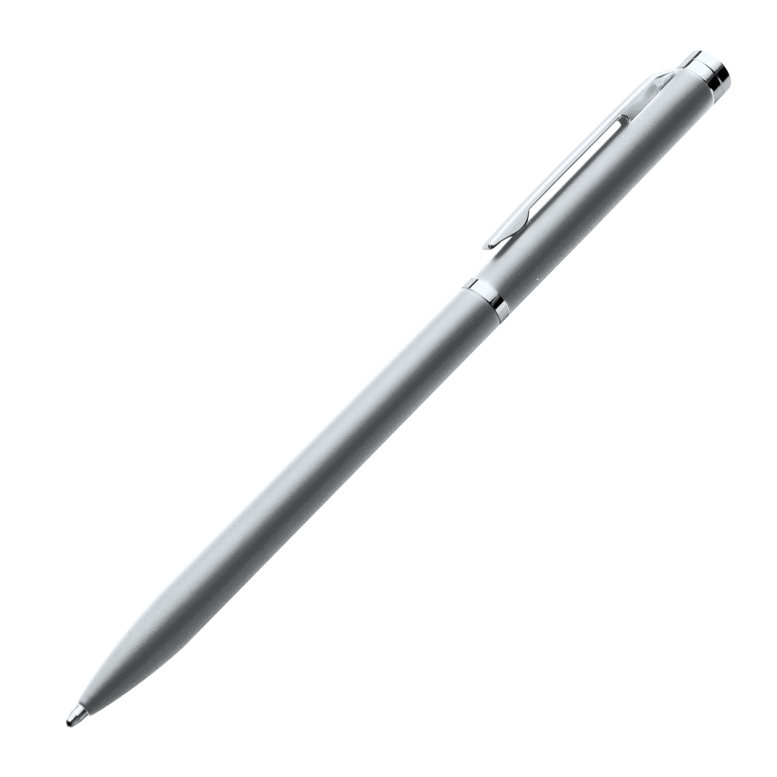 Eleganter Drehkugelschreiber aus Metall in schlanker Form mit verchromtem Clip und blau schreibender Mine. Ihre Werbung lasern wir rechts vom Clip.