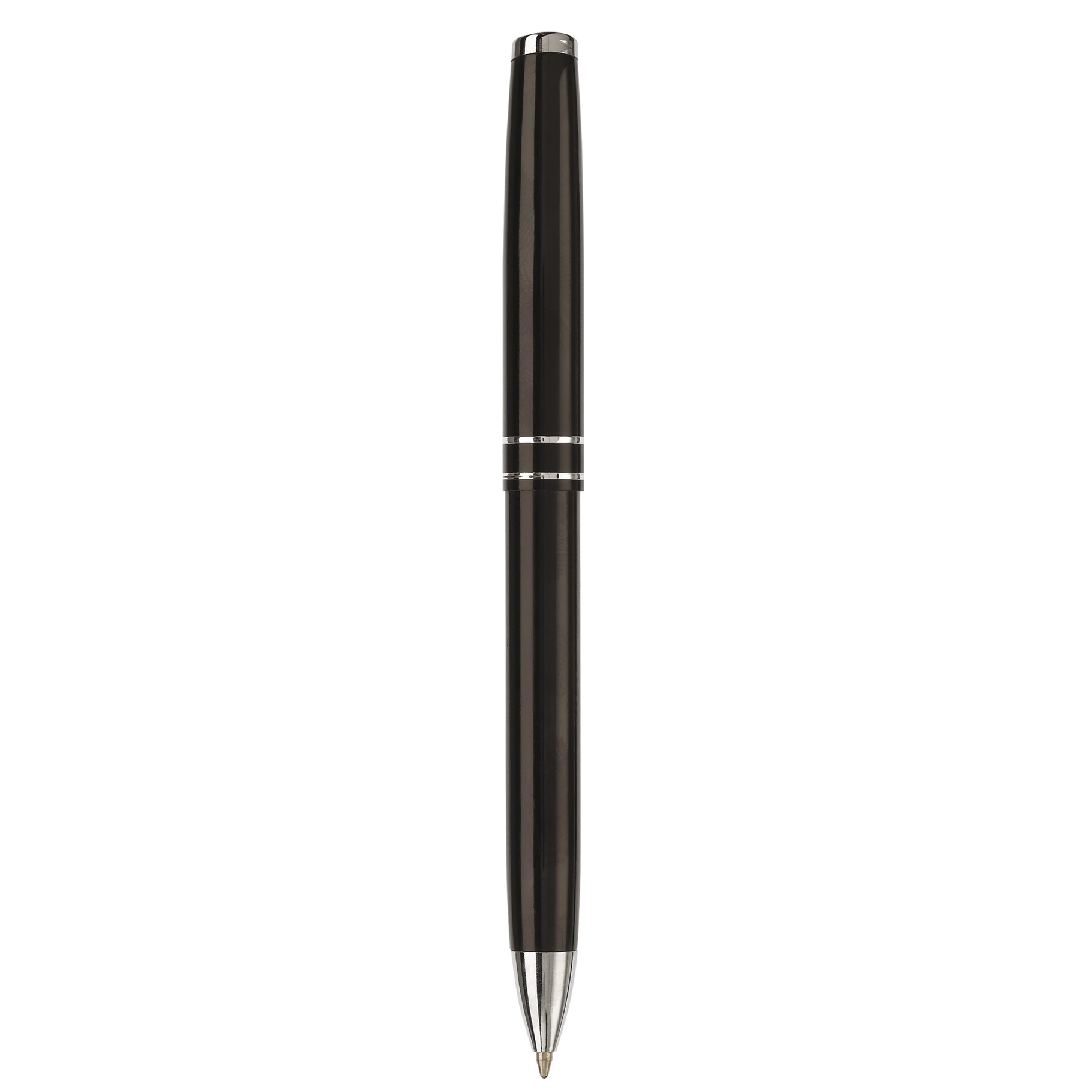 Metallschreibset bestehend aus einem Kugelschreiber mit Drehmechanik und einem Rollerball mit Kappe. Versehen mit einem feinen Streifendesign. Blauschreibend.