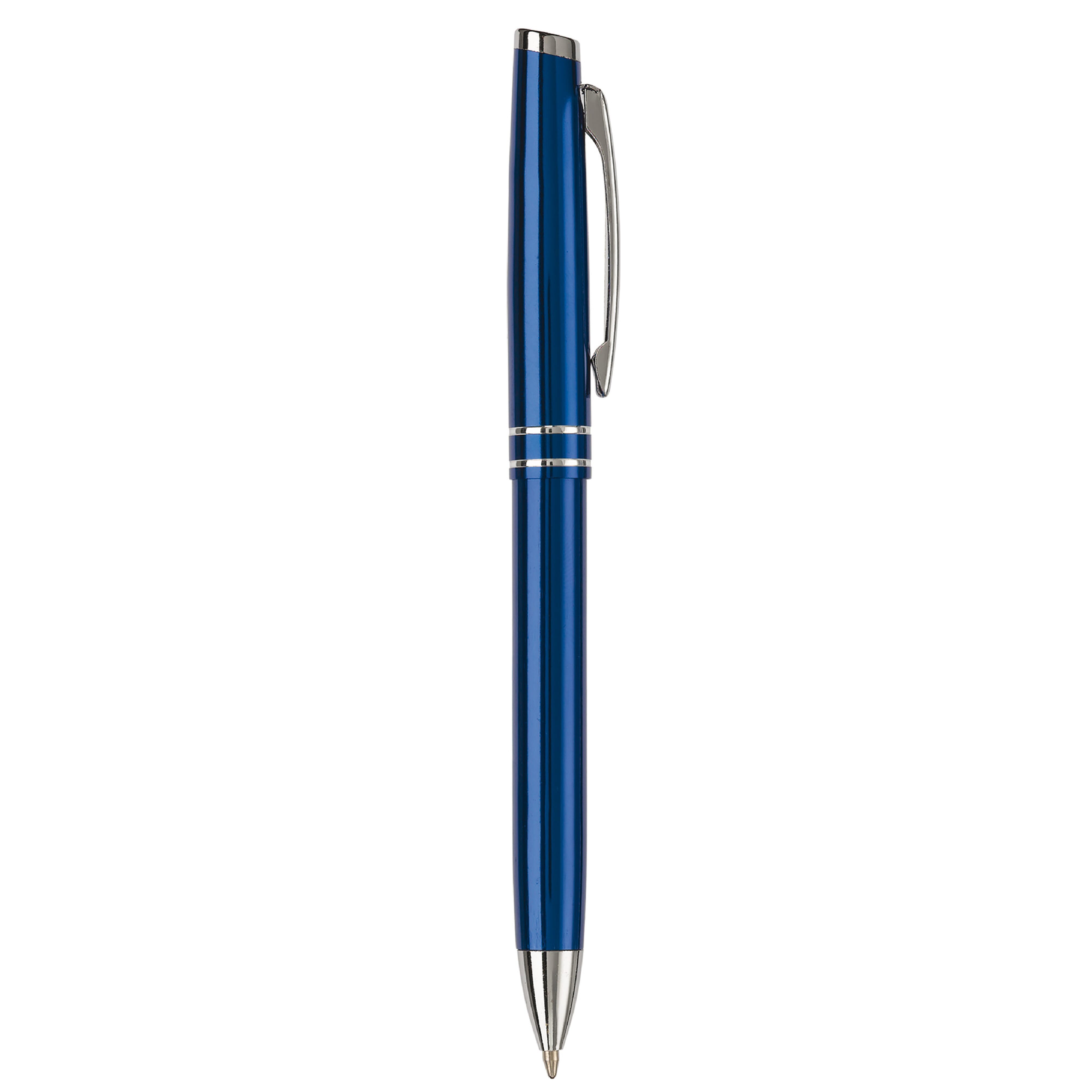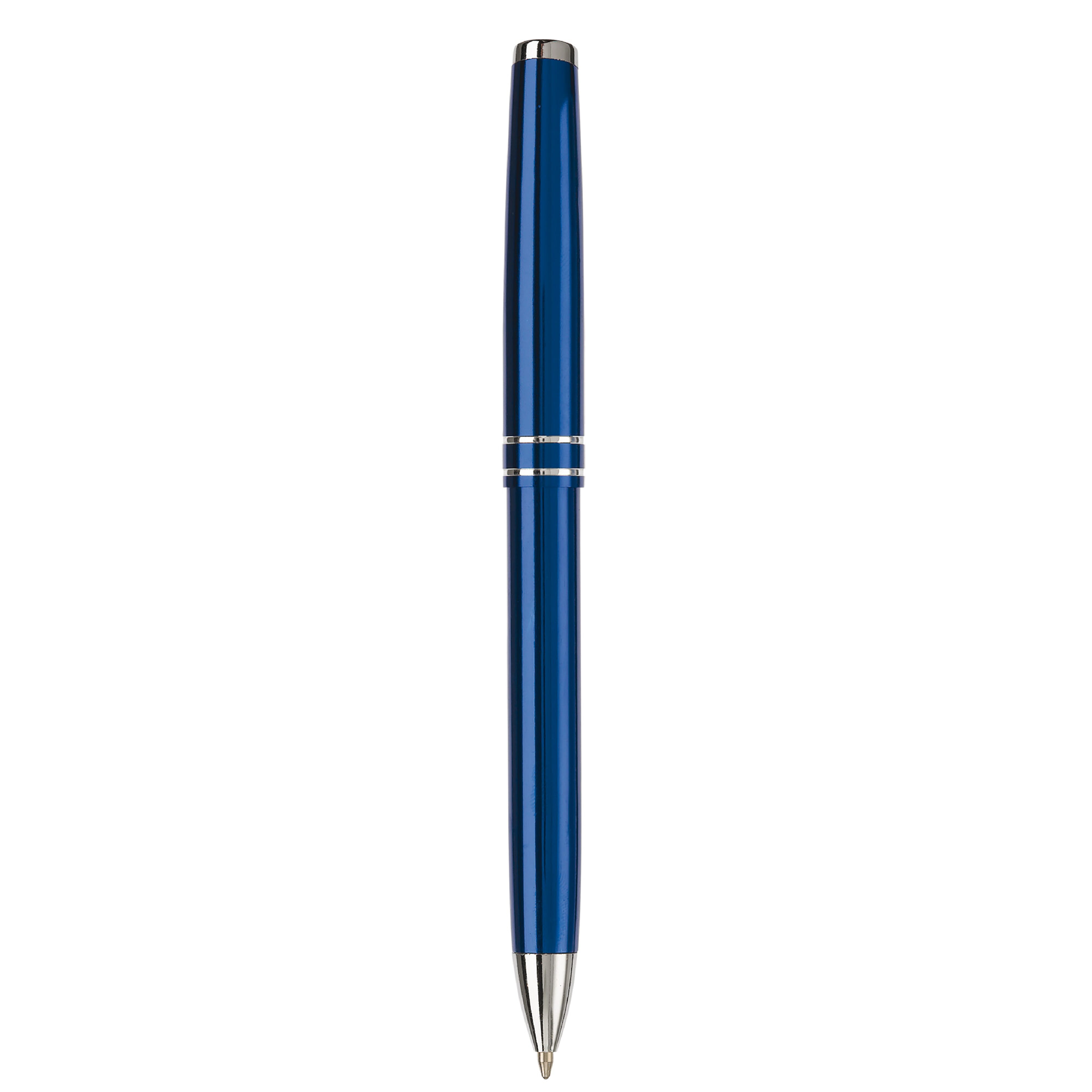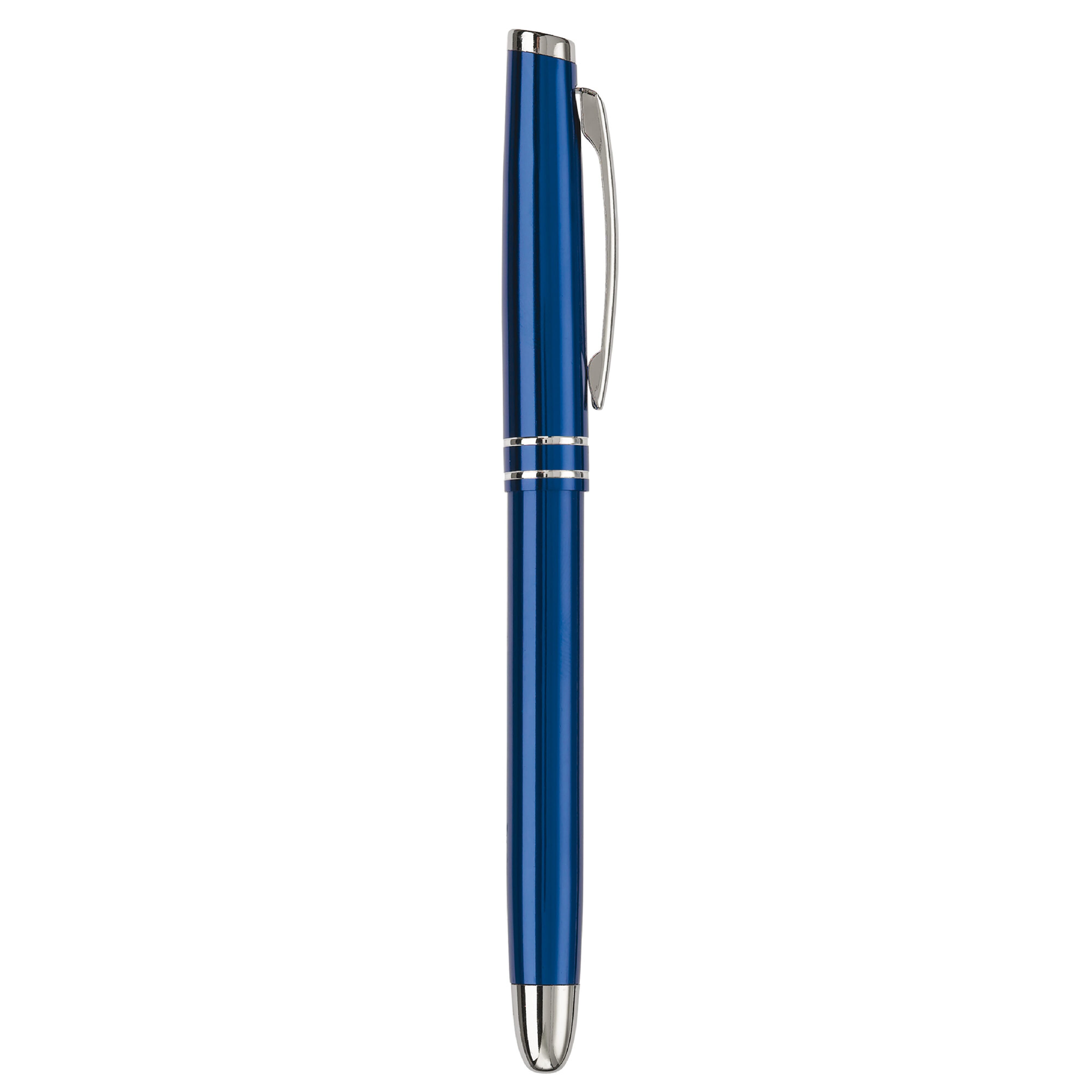 Metallschreibset bestehend aus einem Kugelschreiber mit Drehmechanik und einem Rollerball mit Kappe. Versehen mit einem feinen Streifendesign. Blauschreibend.