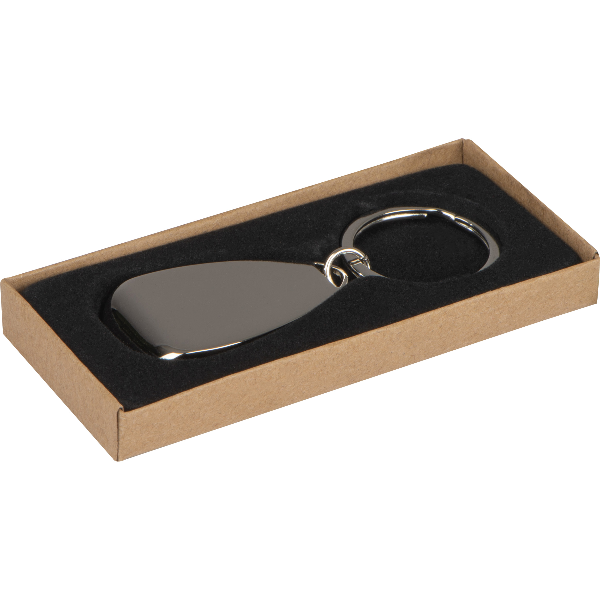 Metall Schlüsselanhänger mit Flaschenöffner, chrom-glänzend. Ihre Werbung gravieren wir auf die Oberseite des Öffners.