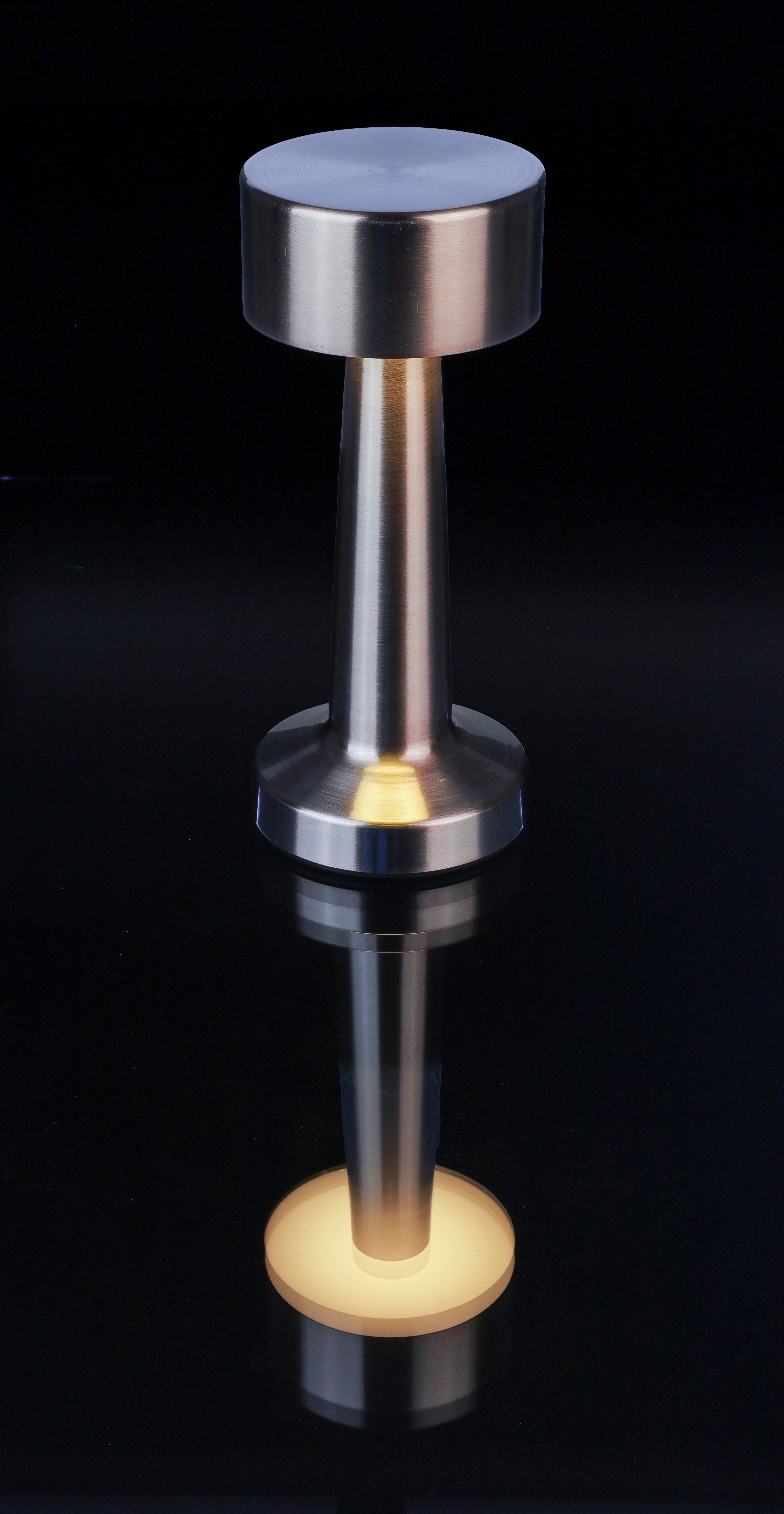 Tischleuchte aus Metall und ABS mit 24 LEDs und drei Lichtmodi (weiß, neutral, warm), die über einen Berührungssensor an der Oberseite gesteuert werden. Inklusive 800 mAh Akku und Ladegerät Typ C mit 1 m Kabel. Die Lampe ist dimmbar und verfügt über einen Ein- / Ausschalter an der Unterseite. Einzeln verpackt in braunem Karton.