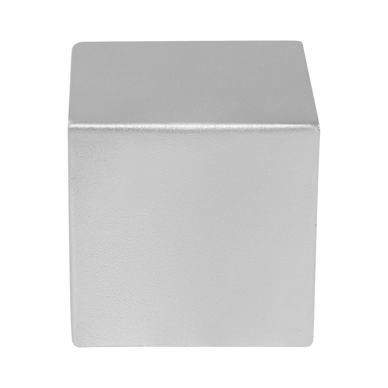 Antistressball in Würfelform aus PU-Schaum mit Metallic-Oberfläche.