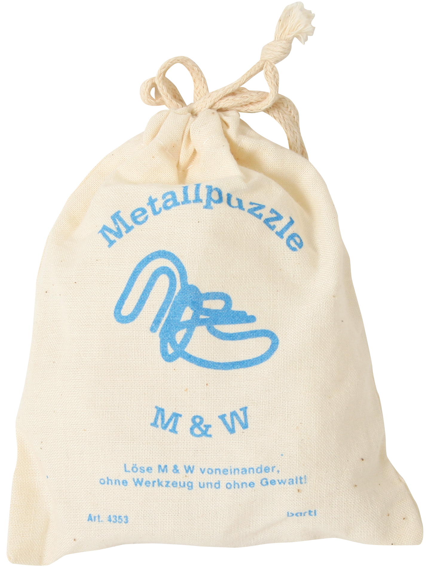 Im Baumwoll-Säckchen. Aufgabe des hochwertigen Metallpuzzles ist es, die Teile voneinander zu trennen und wieder zusammen zu setzen.