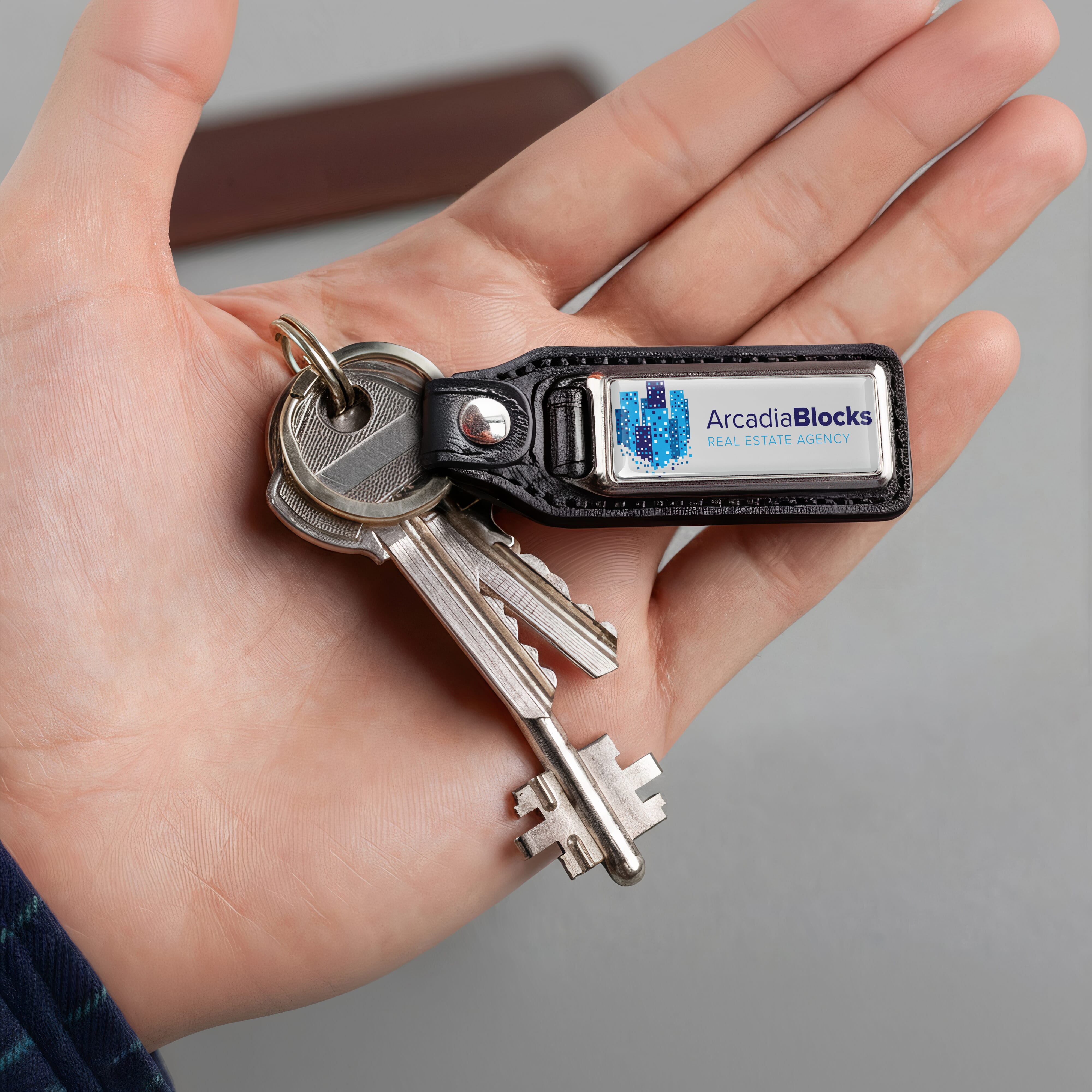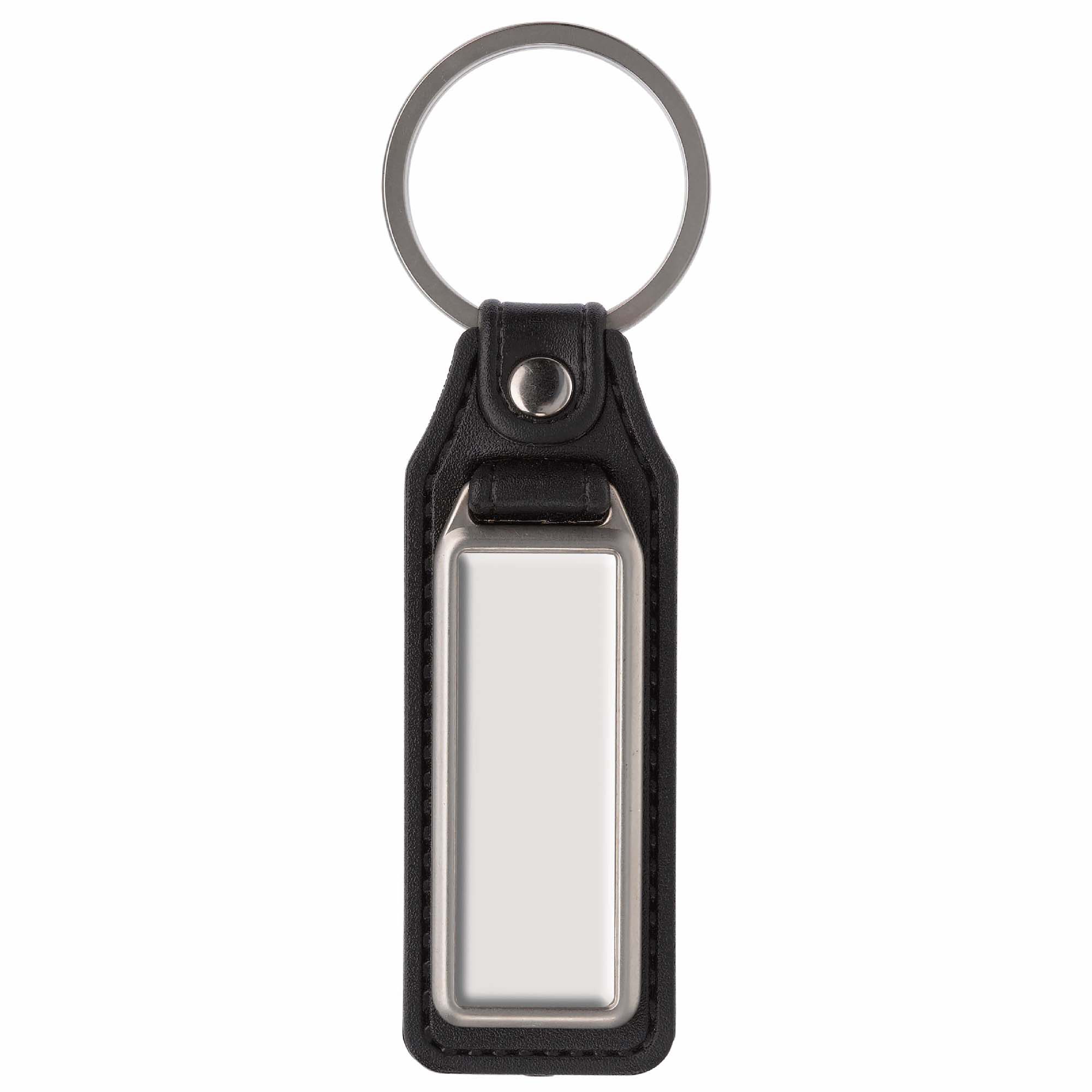 Rechteckiger Metallschlüsselanhänger mit Ring. Einseitiges Doming.