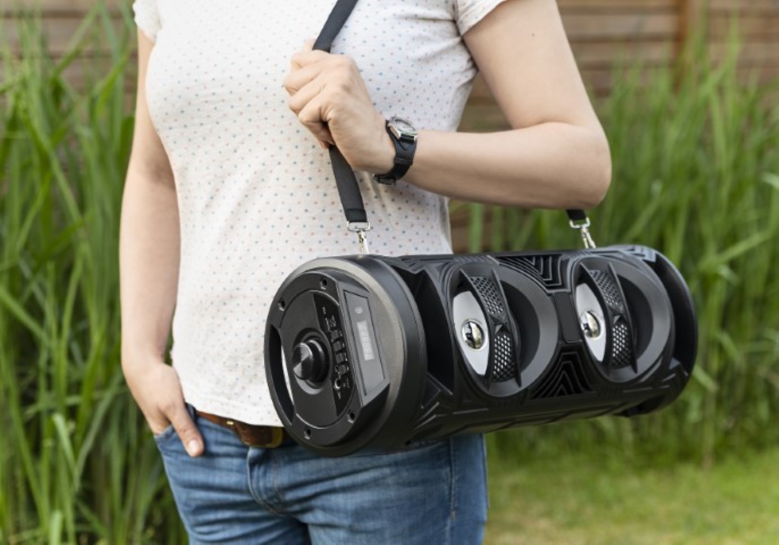 Get the Party started - BoomBox für Zuhause & Unterwegs mit mega Sound (2 x 5 Watt, Subwoofer), Musik per Blue- Wireless 5.0, AUX oder mittels des integrierten FM-Radios - Unabhängiger Musikgenuss Dank eingebauter wiederaufladbarer Batterie für 3-5 h - mit Micro für Ansagen, Stimmung & Gesangseinlangen – inkl. praktischem Tragegurt. 2 x 5 Watt, USB oder Aux-In, TF-Card, Radio FM, Mikrofonanschluß, Leuchtfunktion, Lithium- Ionen-Akku 1.500 mAh, VPE 12. Ladekabel, Trageriemen, Mikrofon, Designbox