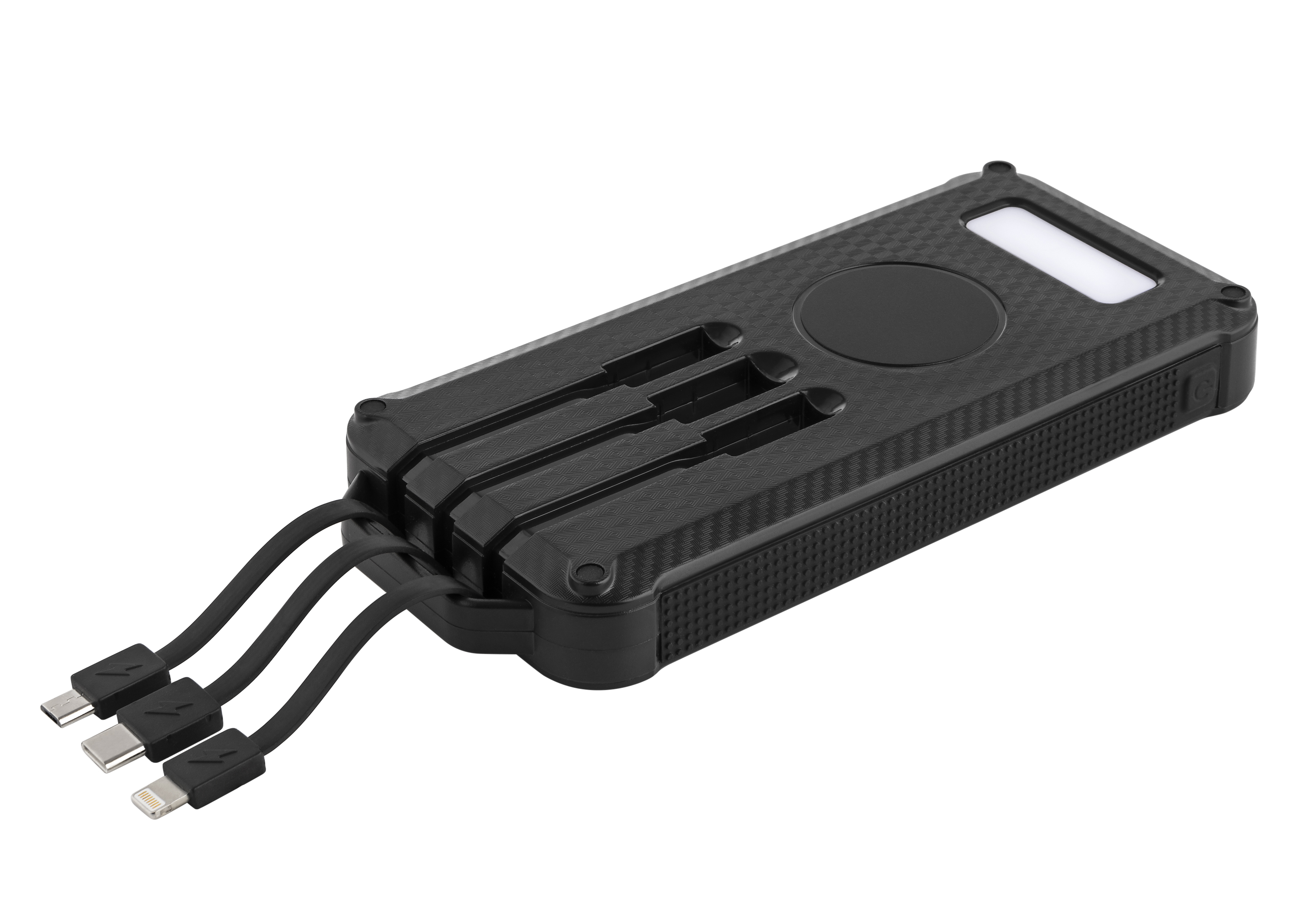 10.000 mAh Solar Powerbank der neusten Generation, ressourcen- und umweltschonendes Gehäuse aus recyceltem ABS (RABS) & mit Recycling PET (RPET) ummanteltes Kabel - für Ihre Unabhängigkeit: großes Solarfeld (bis zu 1,2 Watt, 300 mAh) pflegt / lädt den Akku mit jedem Lichtstrahl der eingefangen wird (auch konventionell aufladbar wenn es schneller gehen soll). Volle Unabhängigkeit durch integrierte Ladekabel auf der Rückseite (Micro- USB, USB-C & Lightning®) und High-Tech Induktions-Ladefeld für kabelloses Laden 5 Watt. Mit outdoortauglicher, heller 2W COB Lampe und Spritzwasserschutz (Ports durch Silikondichtung verschlossen IP5). Durch den verbauten SecurityCircuit (Über / Unterlade / Kurzschluss-Schutz) bietet die Powerbank ein Maximum an Sicherheit. Inkl. 30 cm USB Kabel, Designkarton, Anleitung. IP5, RABS (recycling ABS) Gehäuse, alle Ladekabel on Bord, Wireless 5 W, 1x USB A Port, LED, USB-C und Micro zum Aufladen, Solarfeld, USB-C und Micro zum Laden VPE 50.