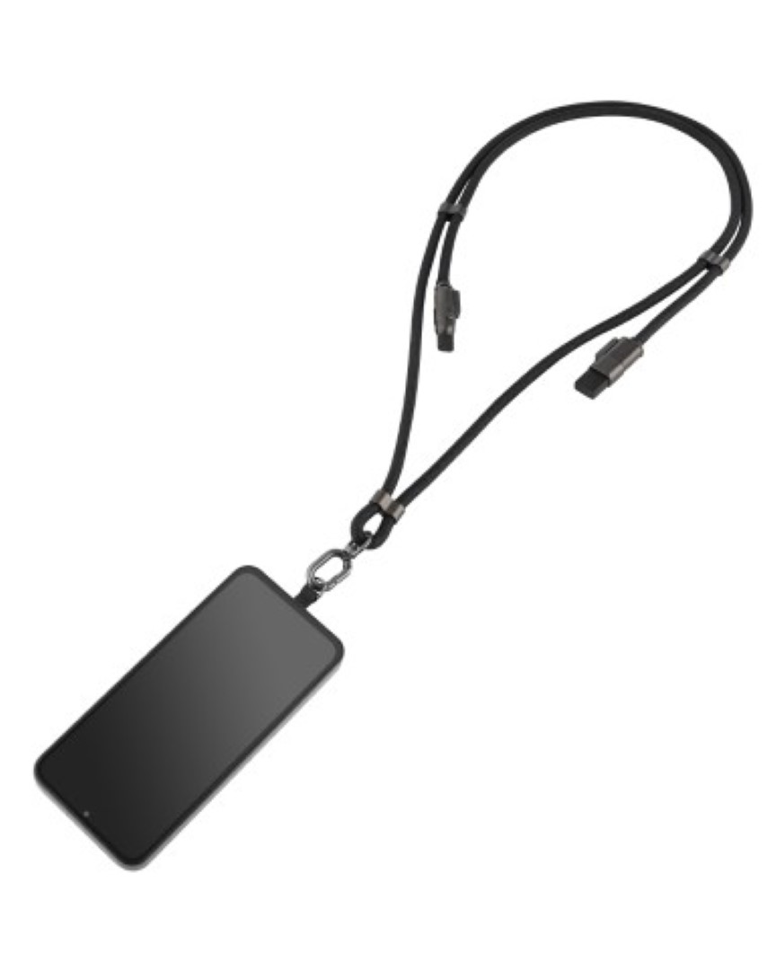 "Deine Power, überall – Carry&ChargePro." Das Carry&ChargePro 4-in-1 ist das tragbare Ladekabel, das sich bequem um den Hals tragen lässt und das Handy sicher befestigt. Mit 60 Watt Leistung, vielseitigen Anschlüssen und Datentransfer ist es die perfekte Lösung für den modernen Lifestyle unterwegs. Im recycelten CraftPaper Box.