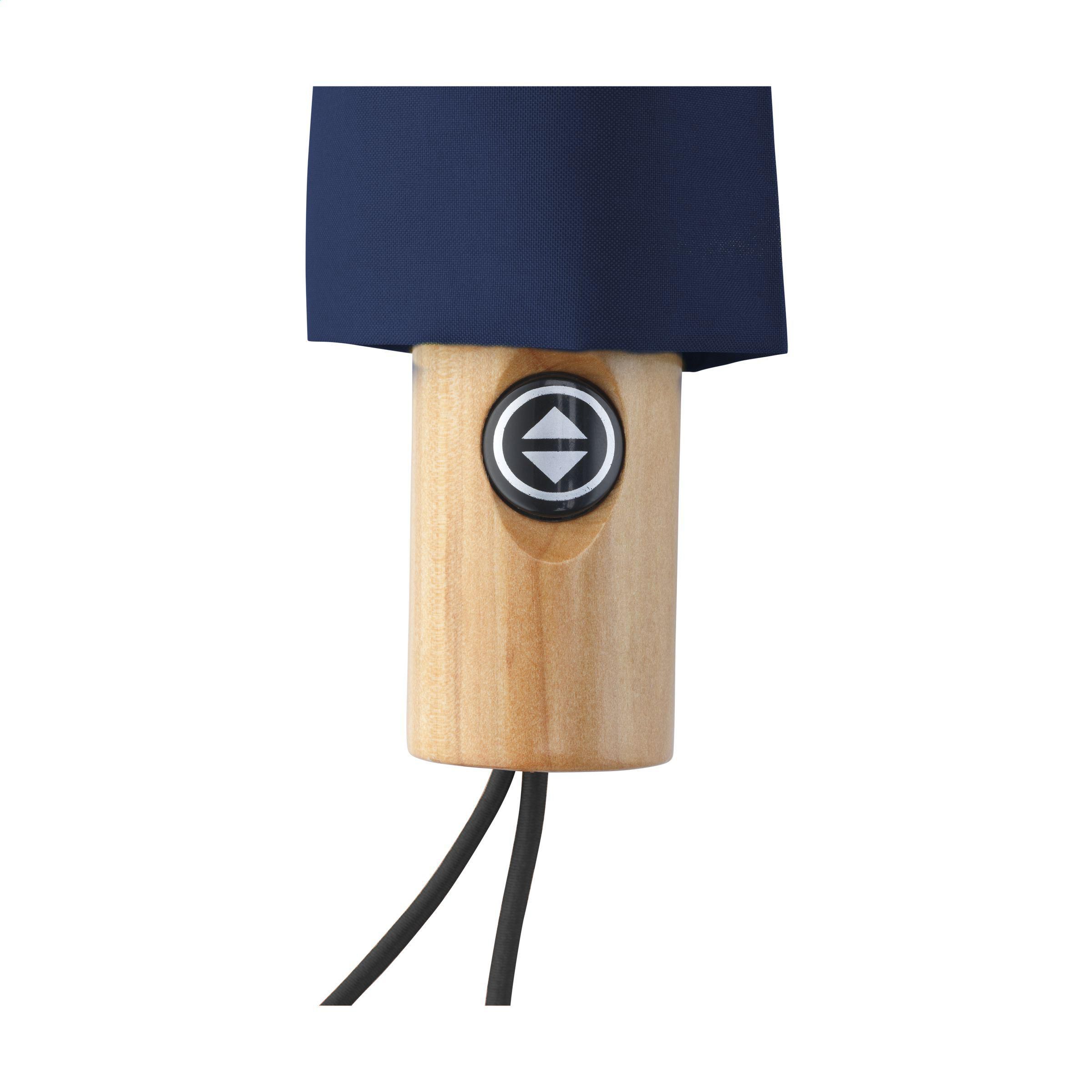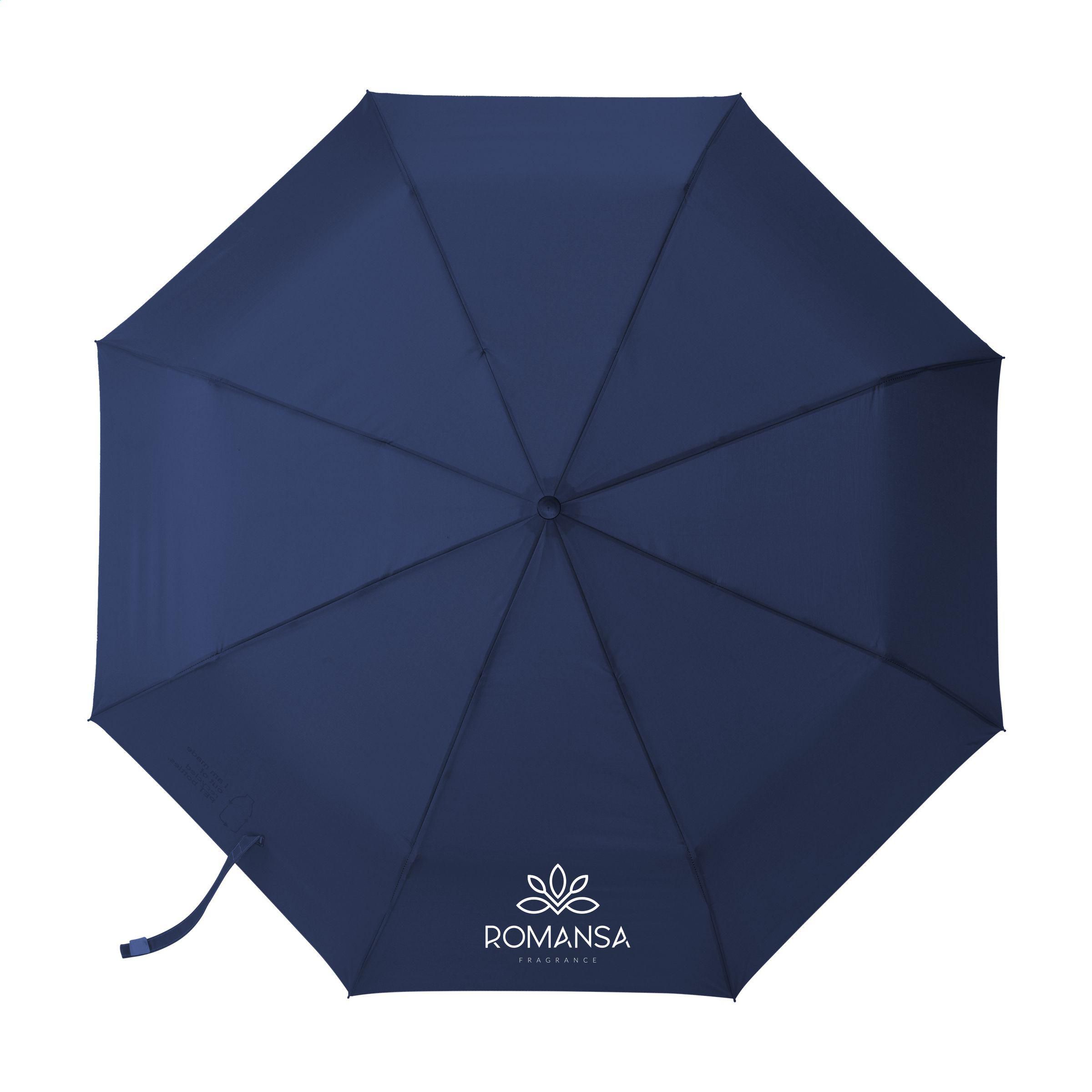 Faltbarer Regenschirm mit automatischem Öffnungs- und Schließmechanismus. Mit einem RPET 190T Pongee-Polyester-Bezug. Dieser Regenschirm ist mit einem Schaft und einem Gestell aus Edelstahl, einem Holzgriff, einer elastischen Handschlaufe und einem Klettverschluss ausgestattet. Lieferung in einer Aufbewarungshülle. Länge zusammengefaltet: 28 cm. Maße zusammengeklappt: Ø 6 x 28,5 cm. RCS-zertifiziert. Recyceltes Material insgesamt: 16%.
