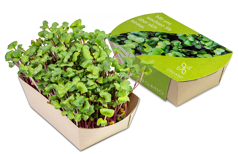 Gesunder Lebensstil, Detox und sogenannte Superfoods sind in aller Munde. Diesem Trend begegnet das Microgreens-Gärtchen, welches die eigene Herstellung von schnellwachsenden essbaren Keimpflanzen mit der Möglichkeit einer Werbebotschaft kombiniert. In der Schale aus Bambuspapier ist es jetzt möglich, eigenes Gemüse anzubauen und frische Vitamine zu gewinnen. Geliefert wird das Gärtchen mit einer Substrattablette und einer Samentüte. Zur Auswahl stehen die Samen der vier essbaren Sorten Salatrauke, Rettich China Rose, Radies Sango und Kresse. Die schnell keimenden Samen in Bio-Qualität können bereits ab einer Höhe von ca. 10 cm geerntet werden. Frisch aufs Brot oder zur Verfeinerung von Salaten, zum Dekorieren von Suppen und vielem mehr. Die rundum individuell bedruckte Banderole aus Graspapiertransportiert perfekt die Werbebotschaft und sorgt für eine positive Wahrnehmung des Unternehmens bei den Kunden.