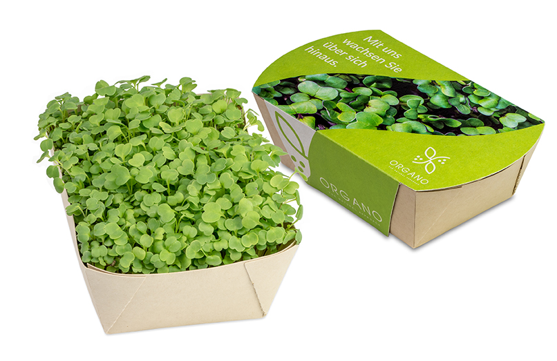 Gesunder Lebensstil, Detox und sogenannte Superfoods sind in aller Munde. Diesem Trend begegnet das Microgreens-Gärtchen, welches die eigene Herstellung von schnellwachsenden essbaren Keimpflanzen mit der Möglichkeit einer Werbebotschaft kombiniert. In der Schale aus Bambuspapier ist es jetzt möglich, eigenes Gemüse anzubauen und frische Vitamine zu gewinnen. Geliefert wird das Gärtchen mit einer Substrattablette und einer Samentüte. Zur Auswahl stehen die Samen der vier essbaren Sorten Salatrauke, Rettich China Rose, Radies Sango und Kresse. Die schnell keimenden Samen in Bio-Qualität können bereits ab einer Höhe von ca. 10 cm geerntet werden. Frisch aufs Brot oder zur Verfeinerung von Salaten, zum Dekorieren von Suppen und vielem mehr. Die rundum individuell bedruckte Banderole aus Graspapiertransportiert perfekt die Werbebotschaft und sorgt für eine positive Wahrnehmung des Unternehmens bei den Kunden.