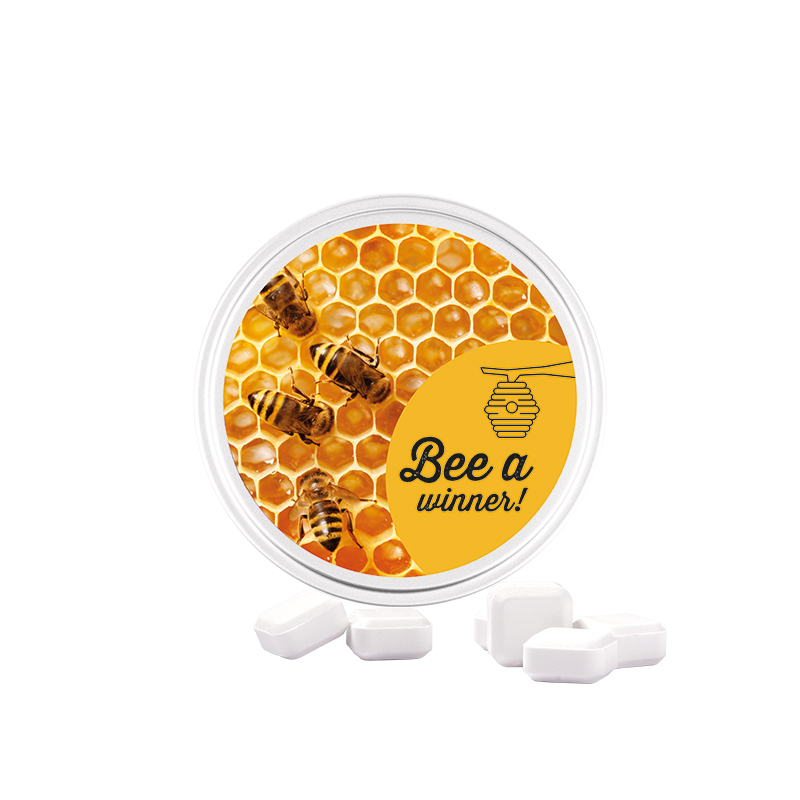 Runde Dose mit Stülpdeckel, weiß, aus Metall, individuell bedruckt. Frische-Versiegelung rundum mit Etikett, Weißblech 98% recycelbar. Inhalt: Traubenzuckerquadrate mit Fruchtgeschmack, 45 g