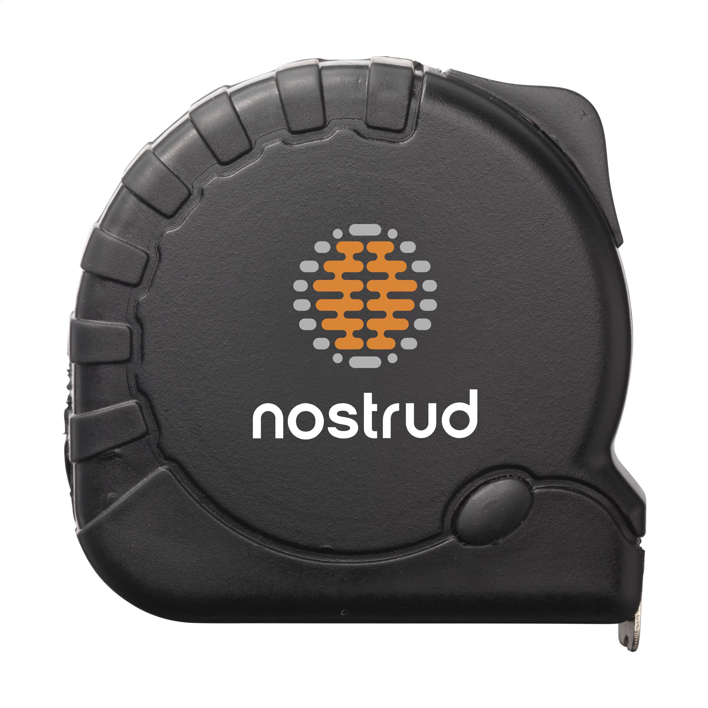 Bandmaß aus recyceltem ABS-Kunststoff. Mit Hartstahlband (Bandbreite 19 mm), Anzeige in Zentimetern und Zoll, rutschfestem Gummigehäuse, Gürtelclip und Handschlaufe.