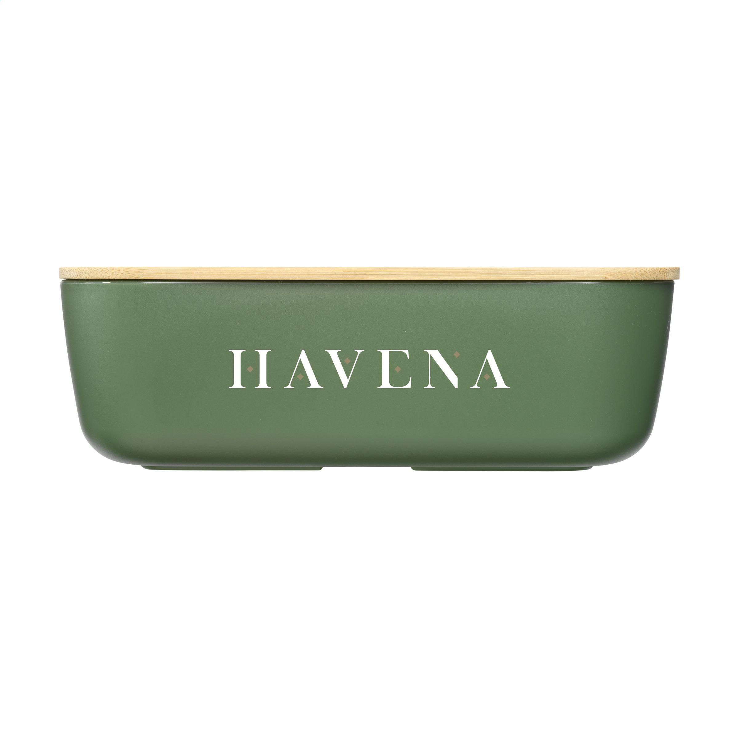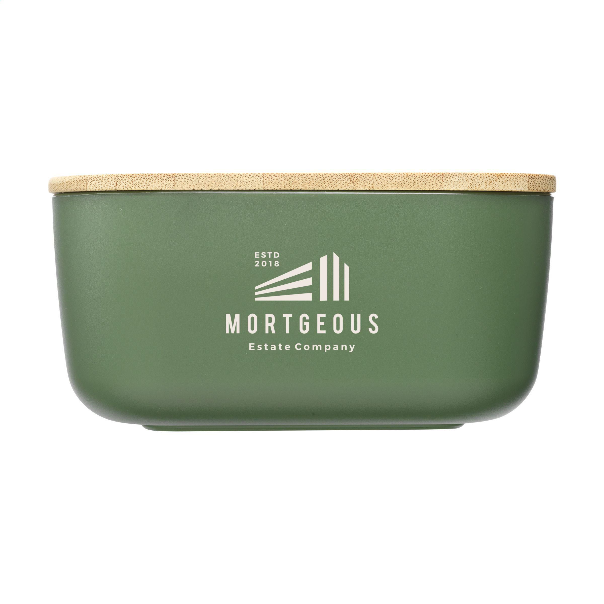 Große Lunchbox aus PP-Kunststoff. Der Deckel ist aus natürlichem Bambus gefertigt. Inklusive Gummiband zum Verschließen. Nicht spülmaschinengeeignet.