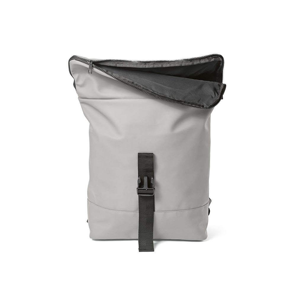 Entdecken Sie den Komfort-design der Milan Rucksack. Dieser 24L Roll-Top-Rucksack mit Reißverschluss und Schnallenverschluss kombiniert recyceltes PU mit hoher Funktionalität. Es verfügt über ein Hauptfach mit einem gepolsterten Laptopfach für Laptops bis zu 17"" und eine Rückenpolsterung, die ihn zum perfekten Begleiter für den Alltag macht. Wird in einem Beutel aus recycelter Baumwolle geliefert.