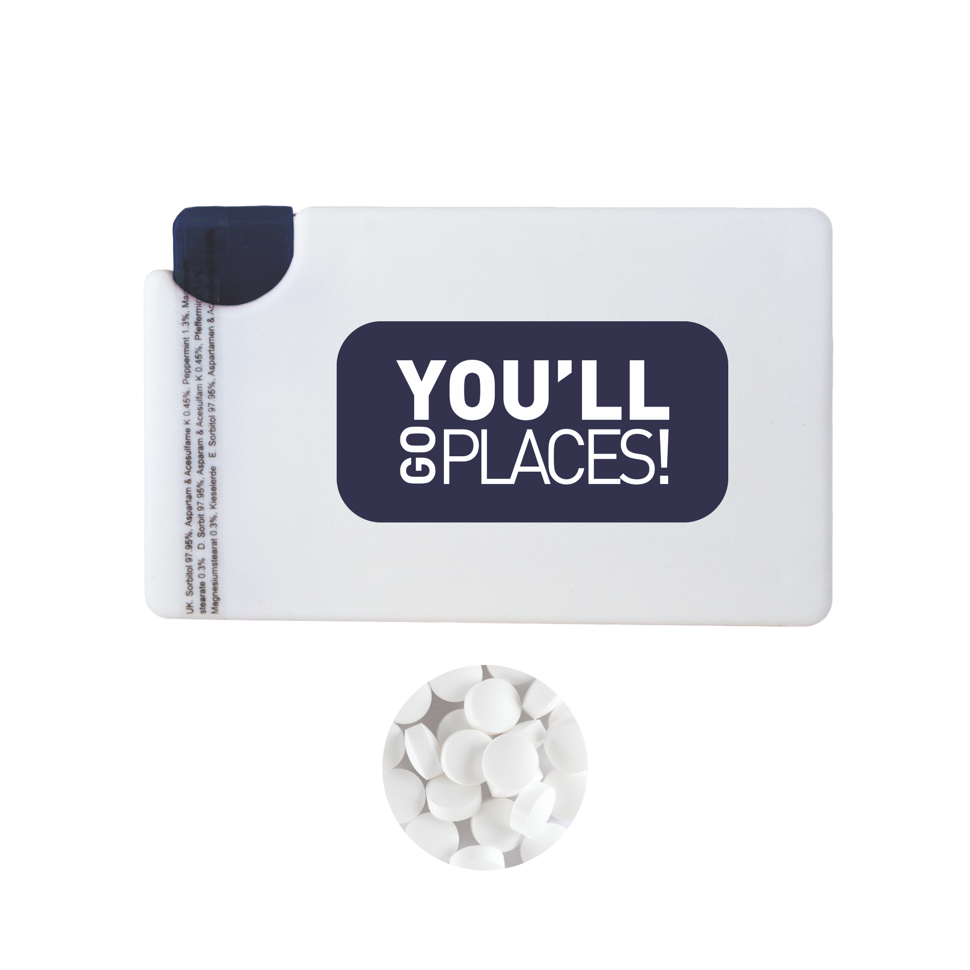 Mintdispenser de Luxe 90 x 48 mm mit ca. 8 gr. Minties zuckerfrei und Zutatenaufkleber, verfügbar in schwarzem und blauem Druckknopf