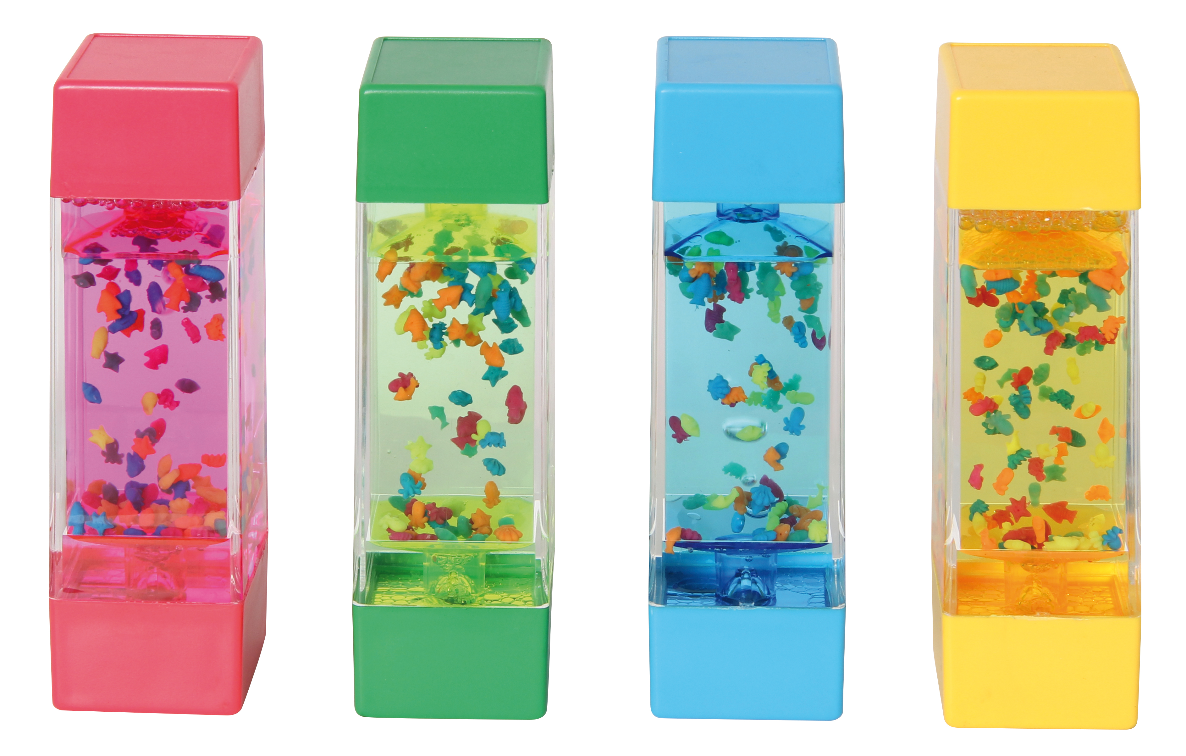 In dem kleinen Gefäß schwimmen winzige Fische und Meerestiere. Durch aufsteigende Luftblasen werden sie durcheinander gewirbelt und in Bewegung gehalten. Ein Teil steigt nach oben, ein Teil sinkt nach unten. Nach ca. 1 Minute hat sich das System beruhigt und kann durch Umdrehen wieder neu gestartet werden.