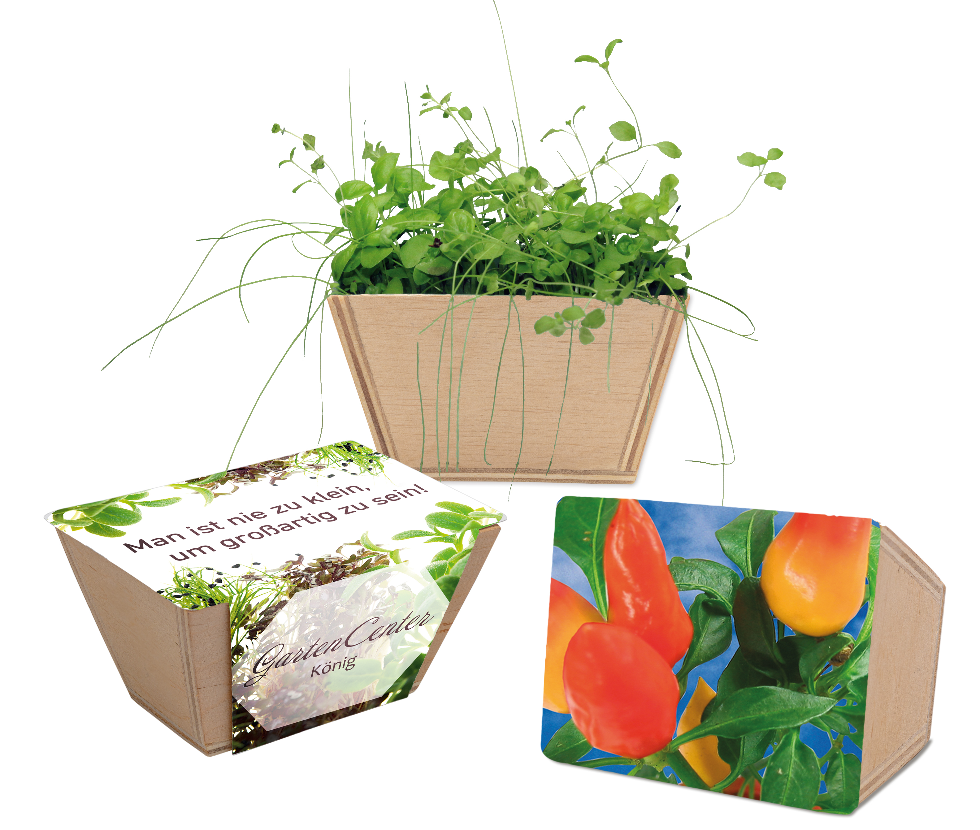 Das attraktive Blumenkästchen aus Holz im Bauernhof-Look enthält eine Substrattablette als Erde sowie eine Kräutersamen-Mischung (Basilikum, Majoran, Schnittlauch) oder Samen nach Wahl. Die Banderole aus Kartonbietet hier die optimale Werbefläche.