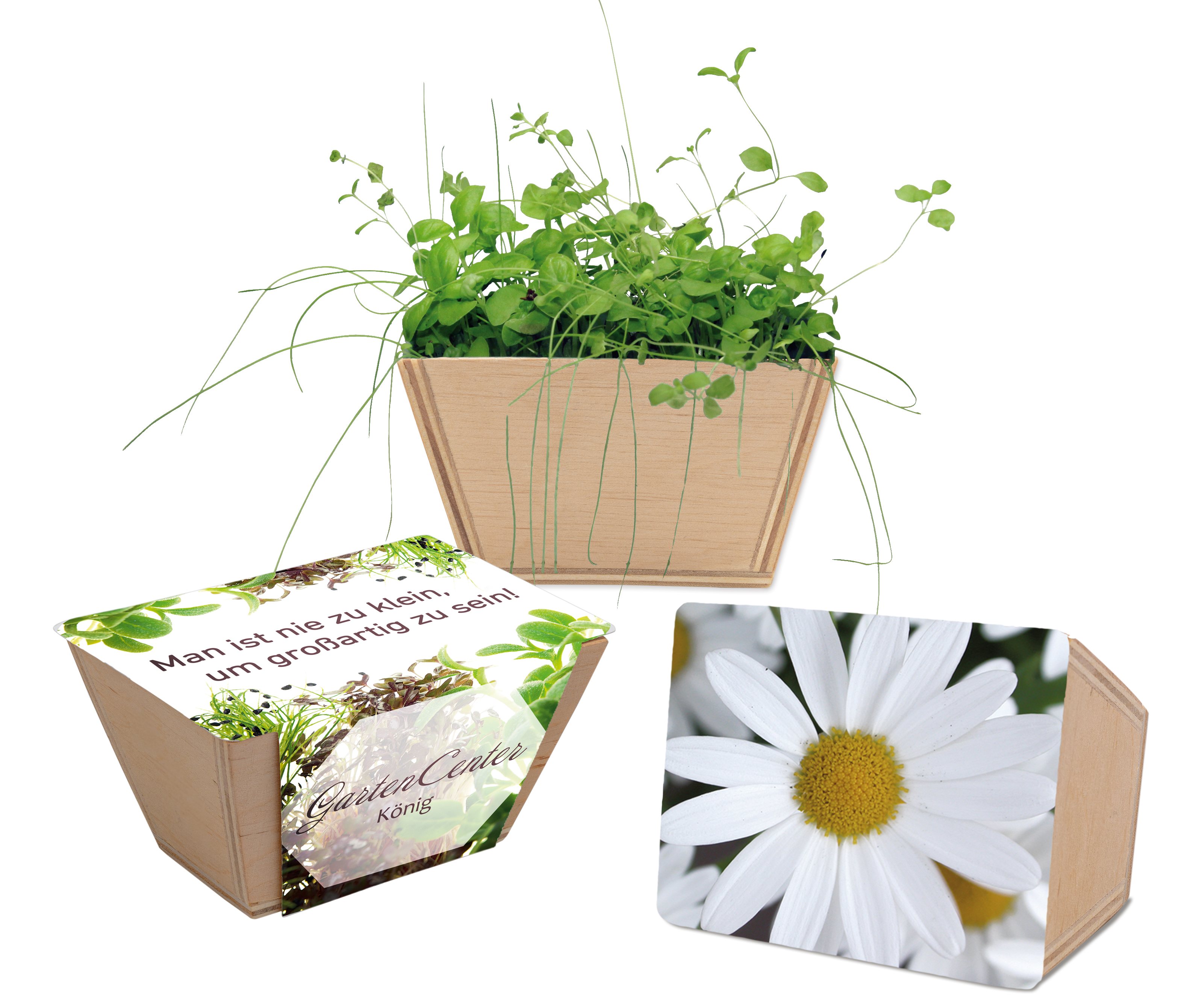 Das attraktive Blumenkästchen aus Holz im Bauernhof-Look enthält eine Substrattablette als Erde sowie eine Kräutersamen-Mischung (Basilikum, Majoran, Schnittlauch) oder Samen nach Wahl. Die Banderole aus Kartonbietet hier die optimale Werbefläche.