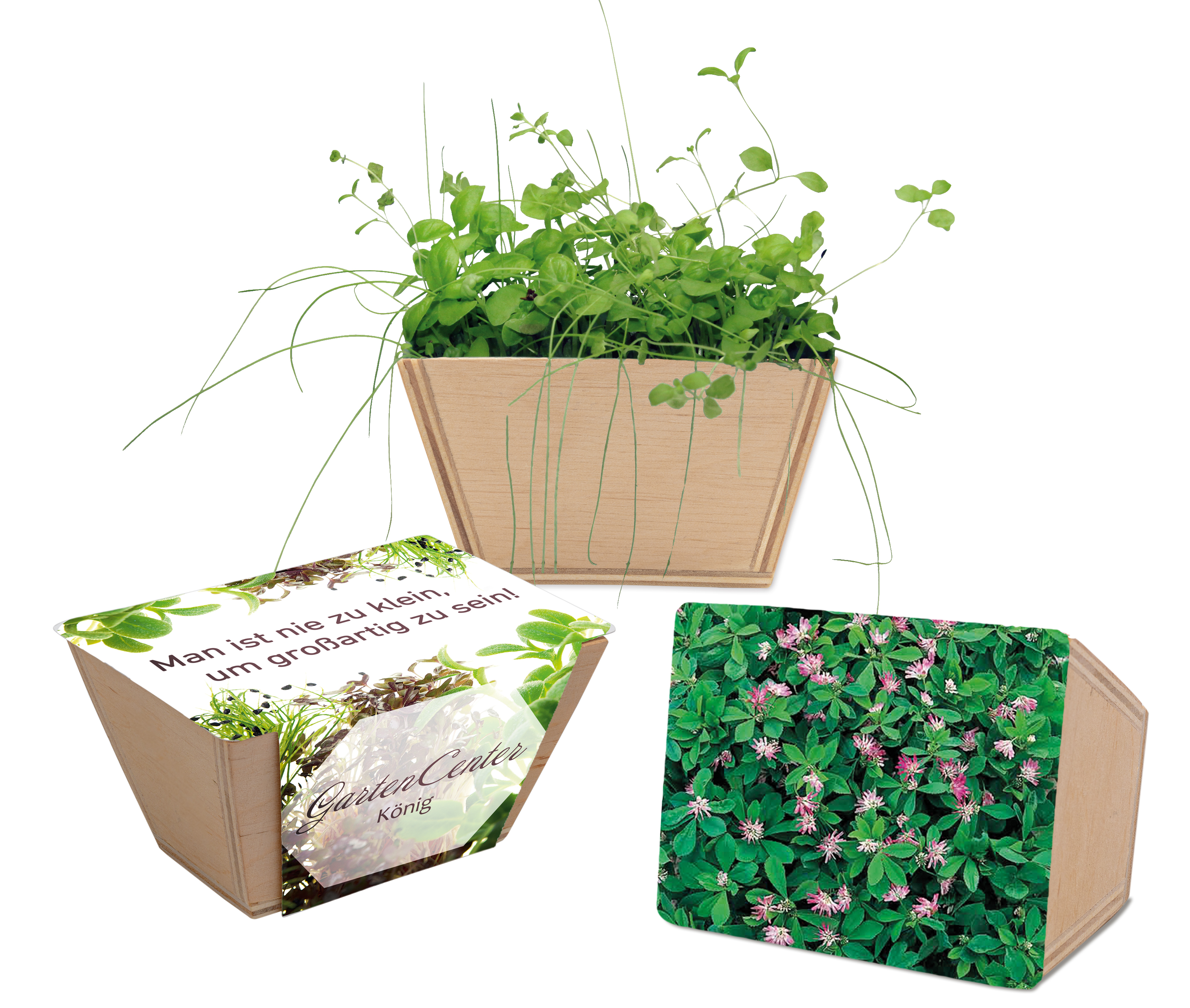 Das attraktive Blumenkästchen aus Holz im Bauernhof-Look enthält eine Substrattablette als Erde sowie eine Kräutersamen-Mischung (Basilikum, Majoran, Schnittlauch) oder Samen nach Wahl. Die Banderole aus Kartonbietet hier die optimale Werbefläche.