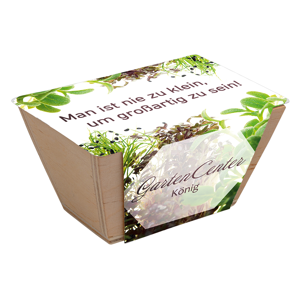 Das attraktive Blumenkästchen aus Holz im Bauernhof-Look enthält eine Substrattablette als Erde sowie eine Kräutersamen-Mischung (Basilikum, Majoran, Schnittlauch) oder Samen nach Wahl. Die Banderole aus Kartonbietet hier die optimale Werbefläche.
