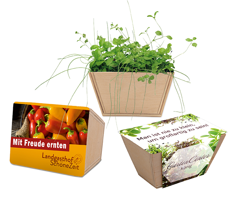 Das attraktive Blumenkästchen aus Holz im Bauernhof-Look enthält eine Substrattablette als Erde sowie eine Kräutersamen-Mischung (Basilikum, Majoran, Schnittlauch) oder Samen nach Wahl. Die Banderole aus Kartonbietet hier die optimale Werbefläche.