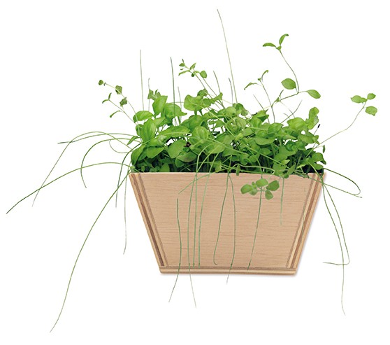 Das attraktive Blumenkästchen aus Holz im Bauernhof-Look enthält eine Substrattablette als Erde sowie eine Kräutersamen-Mischung (Basilikum, Majoran, Schnittlauch) oder Samen nach Wahl. Die Banderole aus Kartonbietet hier die optimale Werbefläche.